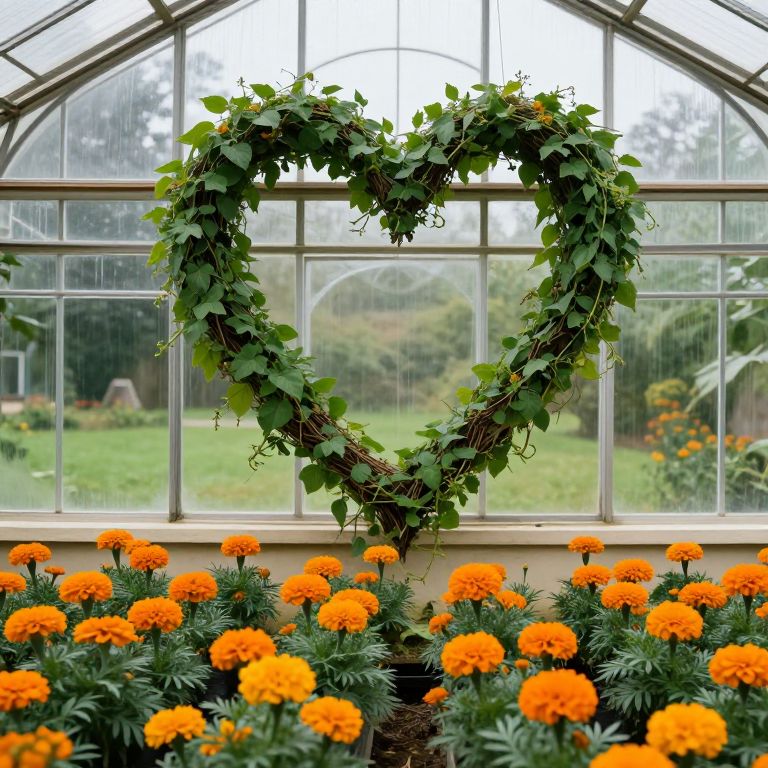 Lush green vines cascade gracefully from a heart-shaped wreath suspended above rows of vibrant orange marigolds, thriving within a greenhouse framed by arched glass panels that reflect the serene outdoors.