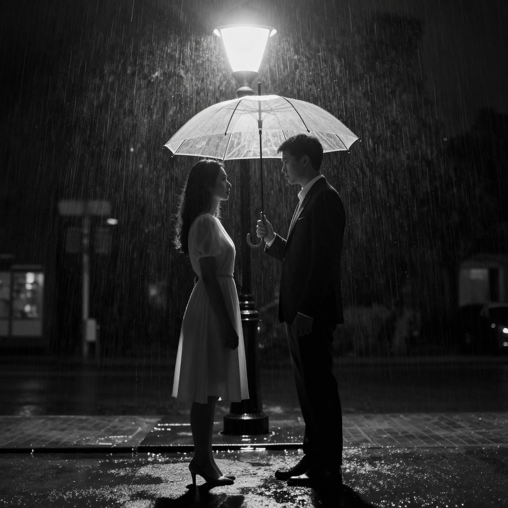 Black and white photograph of an Asian couple standing facing each other under a transparent umbrella in the rain at night. The woman is wearing a knee-length light dress and high heels, while the man is dressed in a dark suit. They are silhouetted against a bright street lamp, with raindrops visible and a wet reflective ground beneath them.