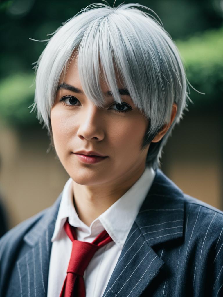 Photo-realistic cosplay photo of person in akagi shigeru costume. 1boy, short hair, white hair, grey hair, medium bangs, collared shirtlifestyle stock photo, shallow depth of field, lifestyle stock photography, shallow depth of field, natural lighting, warm tones, soft background blur, candid moments, vibrant colors, realistic textures, modern casual clothing. full body shot