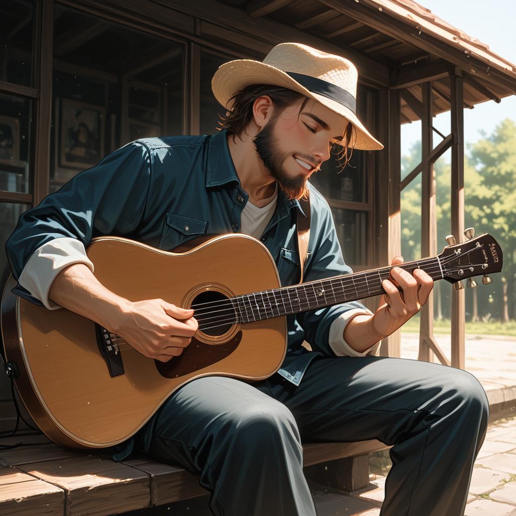 Solo, brown hair, 1boy, hat, sitting, male focus, outdoors, facial hair, instrument, beard, music, guitar, playing instrument, acoustic guitar