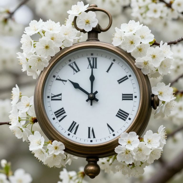 Time blooms: A vintage clock encircled by delicate white flowers defies convention, merging the passage of moments with the organic beauty of nature in a surreal, timeless embrace.