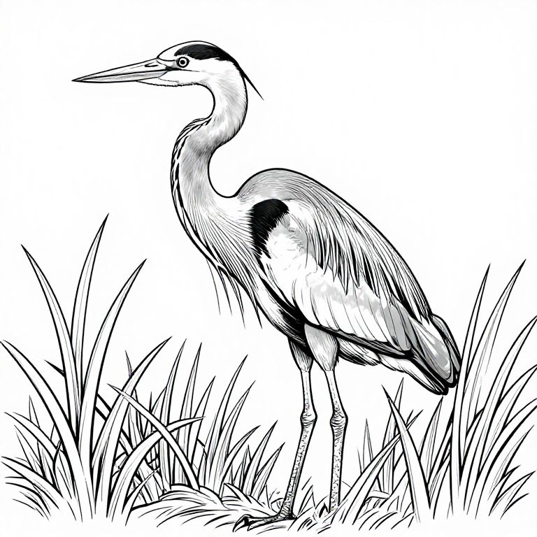 Great blue heron coloring page showing graceful heron standing tall among reeds, intricate linework emphasizing feathers and texture, clean black and white drawing ideal for coloring