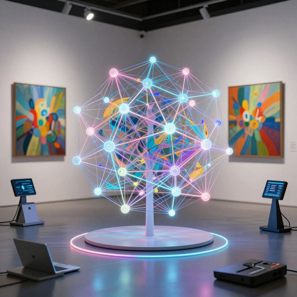 AI for artwork, an advanced neural network visualized as glowing interconnected nodes creating colorful paintings in real-time, surrounded by futuristic devices and digital tools, a blend of organic creativity and synthetic intelligence in a high-tech gallery