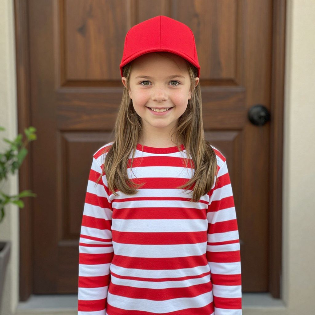 Girl Wheres Waldo Costume, image of a little girl in a red hat and striped shirt