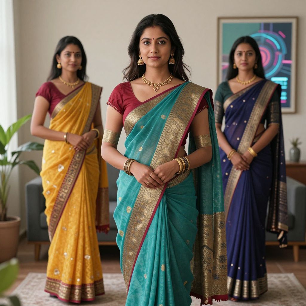 AI prompts for Indian women in a modern, vibrant studio setting with traditional sarees and digital art elements, blending cultural elegance with futuristic tech, soft natural lighting, and a balanced composition reflecting empowerment and innovation.