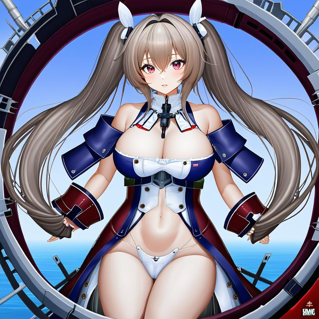 Digital anime-style illustration of a female character from Azur Lane, featuring long light brown twintails, purple-red eyes, and a detailed naval-themed outfit. She has large breasts, exposed cleavage, and bare shoulders, wearing a white and navy blue costume with anchor motifs. A stylized battleship floats in the background over a blue ocean with dynamic lines.