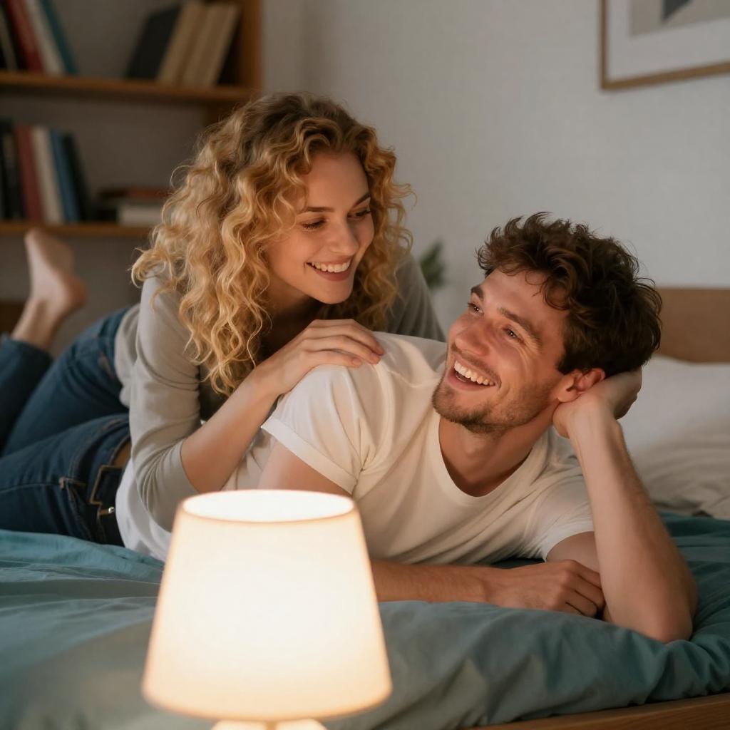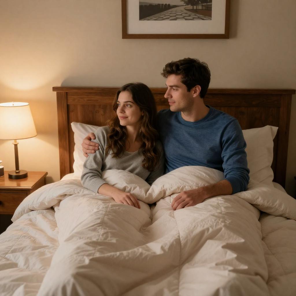Photograph of a man and woman sitting in bed under a beige quilt. The man, with short dark hair and a blue long-sleeve shirt, has his arm around the woman, who has long brown hair and a gray sweater. Warm yellow lamp light illuminates the wooden headboard and beige walls. A framed picture hangs above the bed.