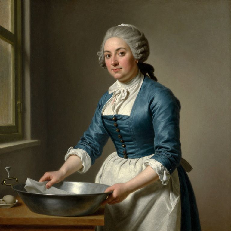 A finely detailed oil painting by Jean-Baptiste Greuze depicts a laundress in a serene interior setting, characterized by soft natural lighting and meticulous attention to texture and composition, capturing the essence of 18th-century realism.