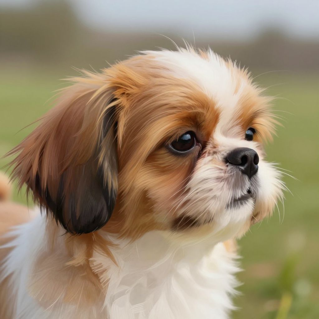 Shih Tzu side profile portrait, focusing on the elegant muzzle and distinctive coat pattern, digital painting style with vibrant colors, soft brush strokes, gentle wind lightly tousling the fur, serene outdoor setting.
