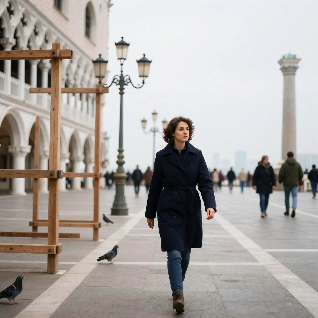 Photograph of a woman in a dark blue coat walking on a piazza. Wooden scaffolding on the left, ornate lampposts, pigeons, and tall columns in the background. White building with arches on the left, distant city buildings. Multiple people in the distance. Overcast sky. Woman has short curly hair, walking calmly.