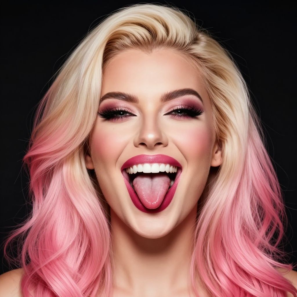 Photograph of a smiling woman with platinum blonde hair that transitions to pink at the ends, against a black background. She has fair skin, heavily made-up eyes with pink eyeshadow, thick black eyeliner, and long eyelashes. Her full, pink lipstick is complemented by her wide smile, showing white teeth, and her tongue is playfully sticking out. The lighting is bright, highlighting her facial features and hair color, creating a vivid and striking contrast with the dark background. The image is highly stylized, emphasizing a playful and vibrant aesthetic.
