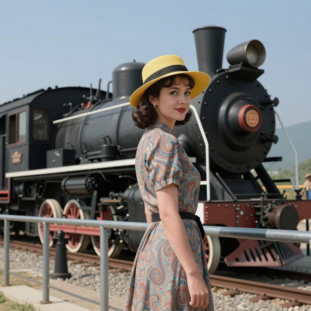 Vintage photograph of a woman in a paisley dress and yellow hat standing in front of an old black steam locomotive. She looks over her shoulder with a slight smile. A man in a brown shirt and hat is working on the locomotive in the background. Clear blue sky, distant mountains. Metal railing in front of the locomotive.