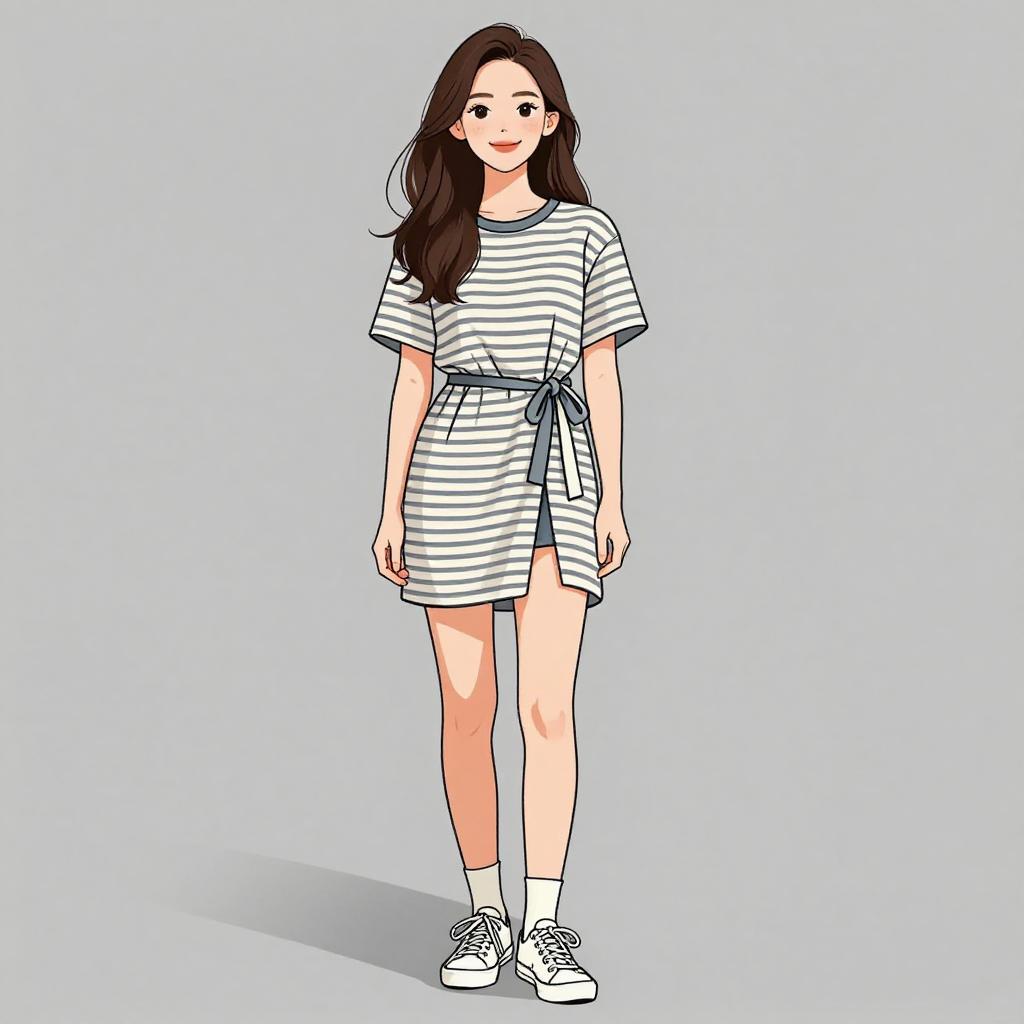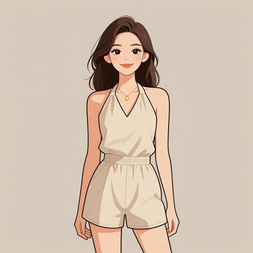 Woman with pretty face and pretty hair. smiling Woman, casual sporty, grey jersey knit romper, short sleeves, elastic waistband, round neckline, relaxed fit shorts, navy blue low-top sneakers, white crew socks with ribbed cuffs, thin metallic choker necklace, minimalist setting with white walls and light wooden floor. --sref 1467
