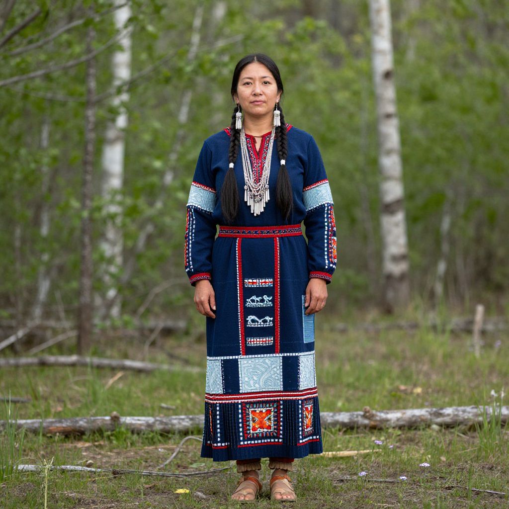 Photograph of a young Indigenous woman with long black hair, wearing a traditional dark blue embroidered dress, standing in a forest with birch trees and green