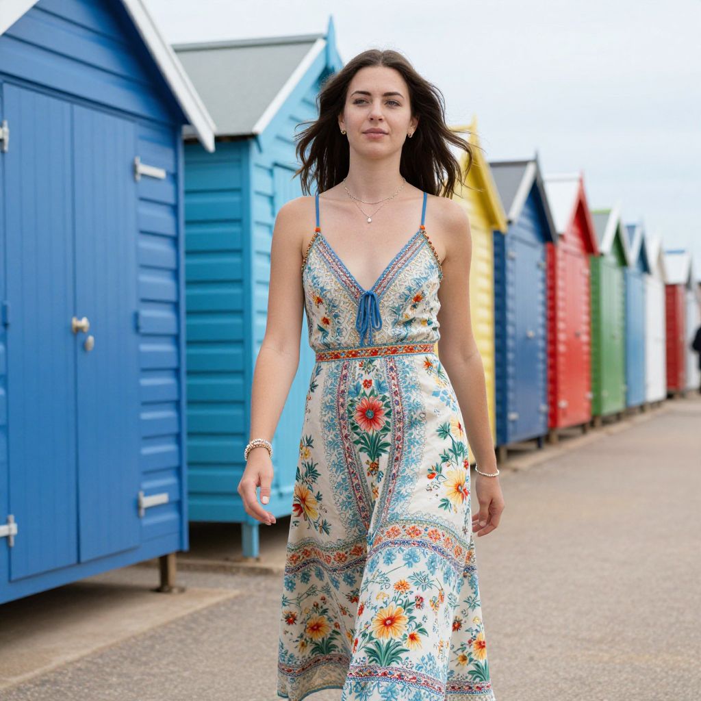 Woman strolling along a vibrant promenade lined with colorful beach huts, wearing a charming floral sundress and accessorized with a delicate necklace and bracelets, as her hair flows gracefully in the breeze.