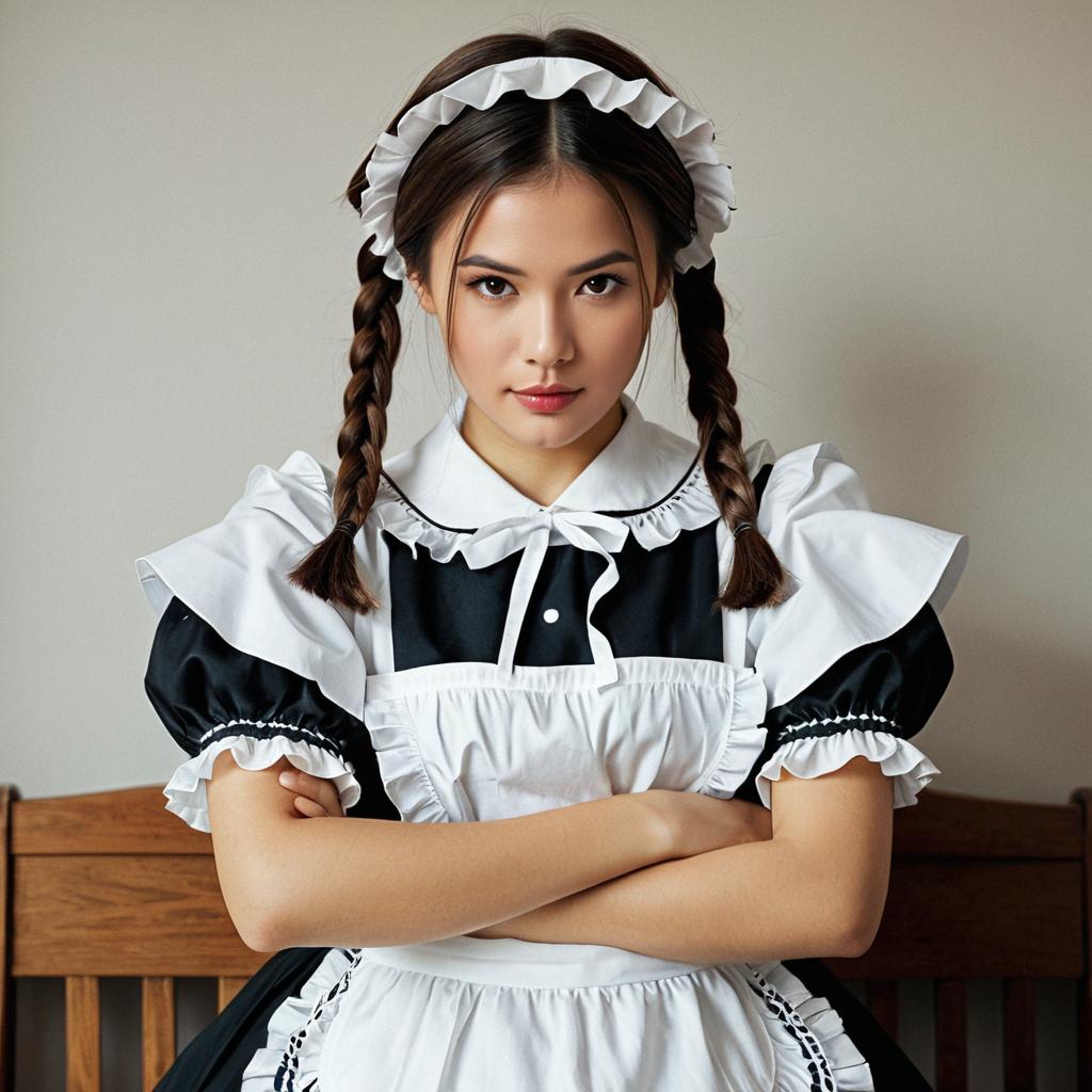 Klee maid outfit ,1girl, solo, realistic, twin braids, braid, maid, brown hair, dress, maid headdress, apron, short sleeves, brown eyes, looking at viewer, frills, puffy sleeves, puffy short sleeves