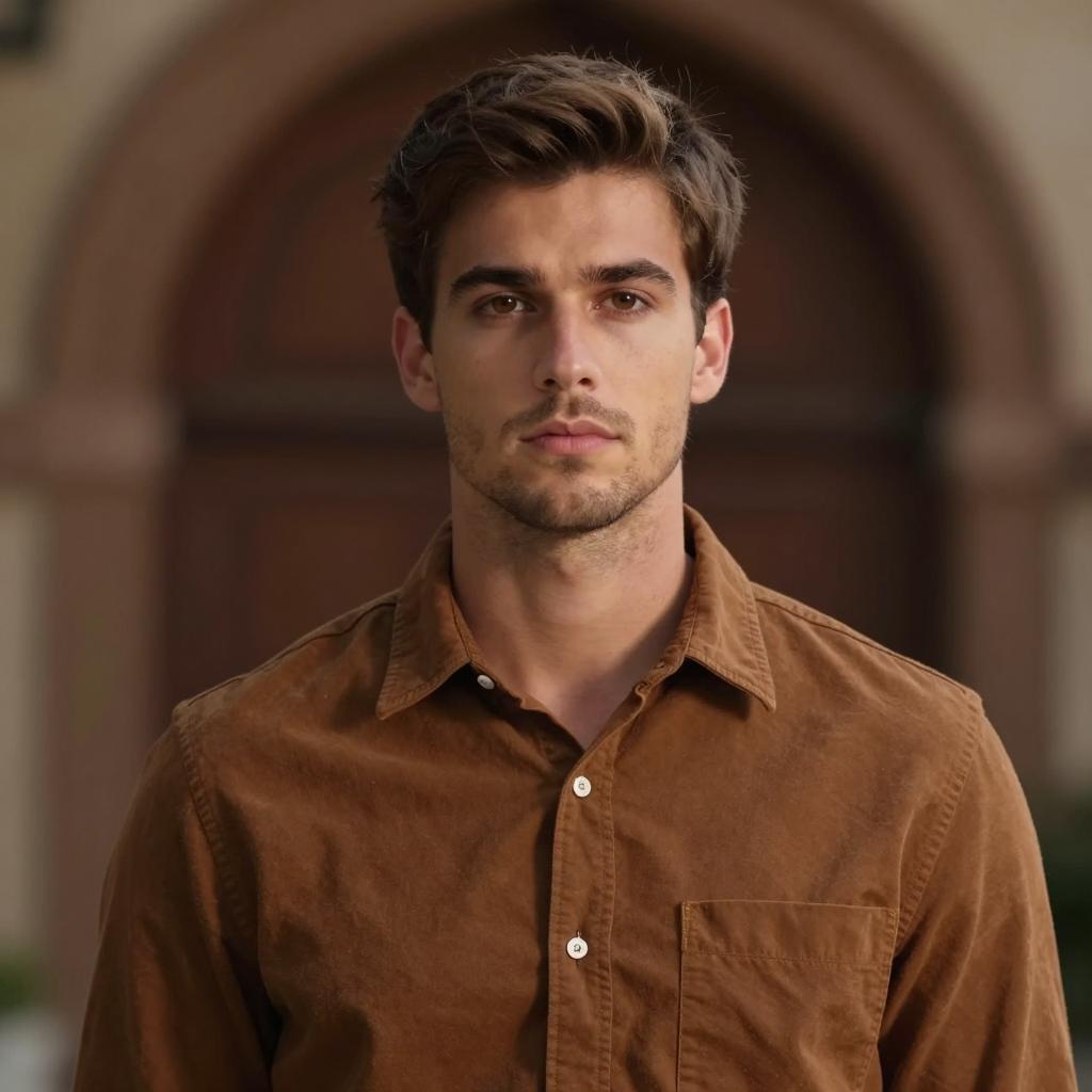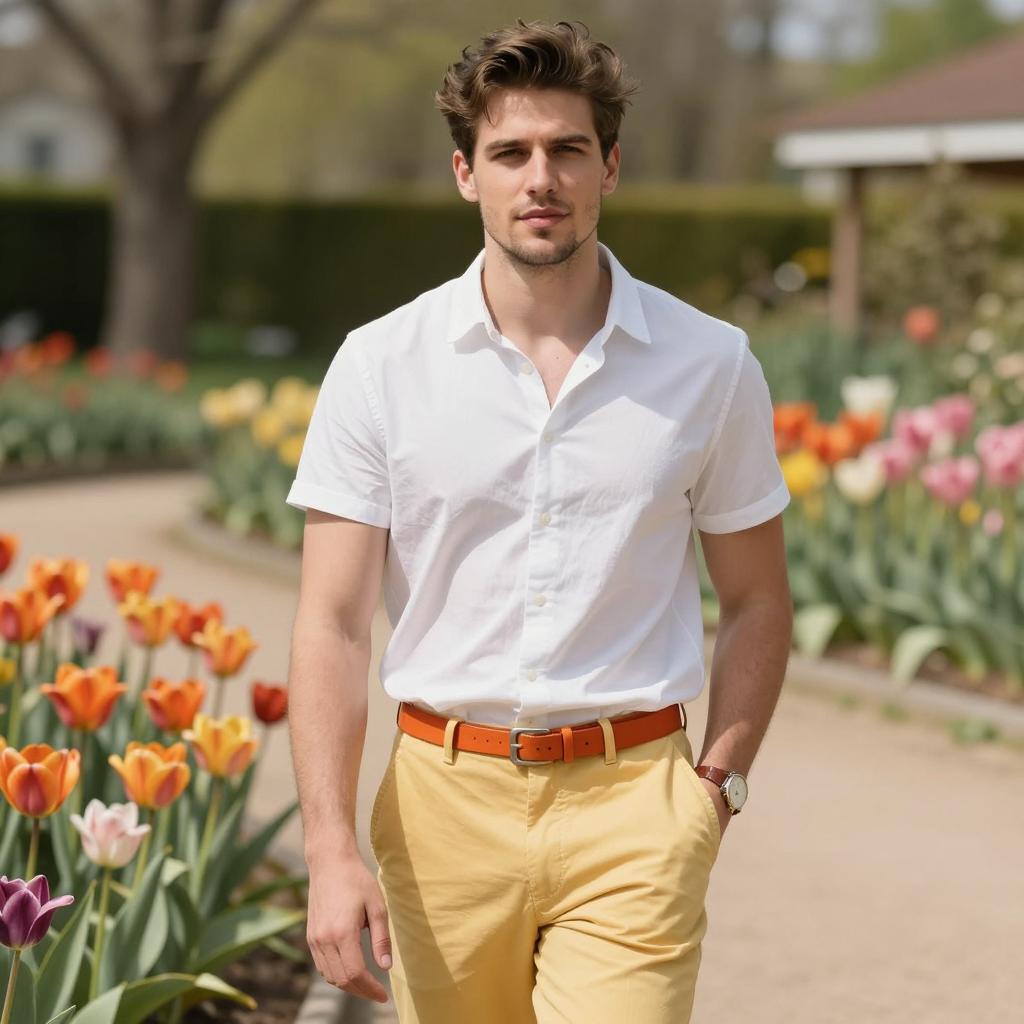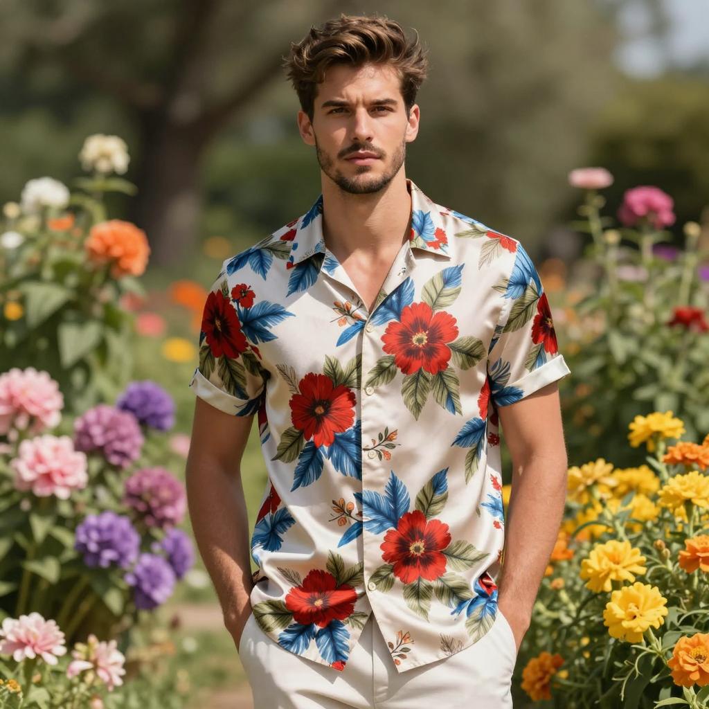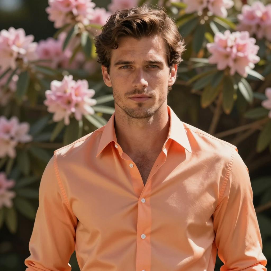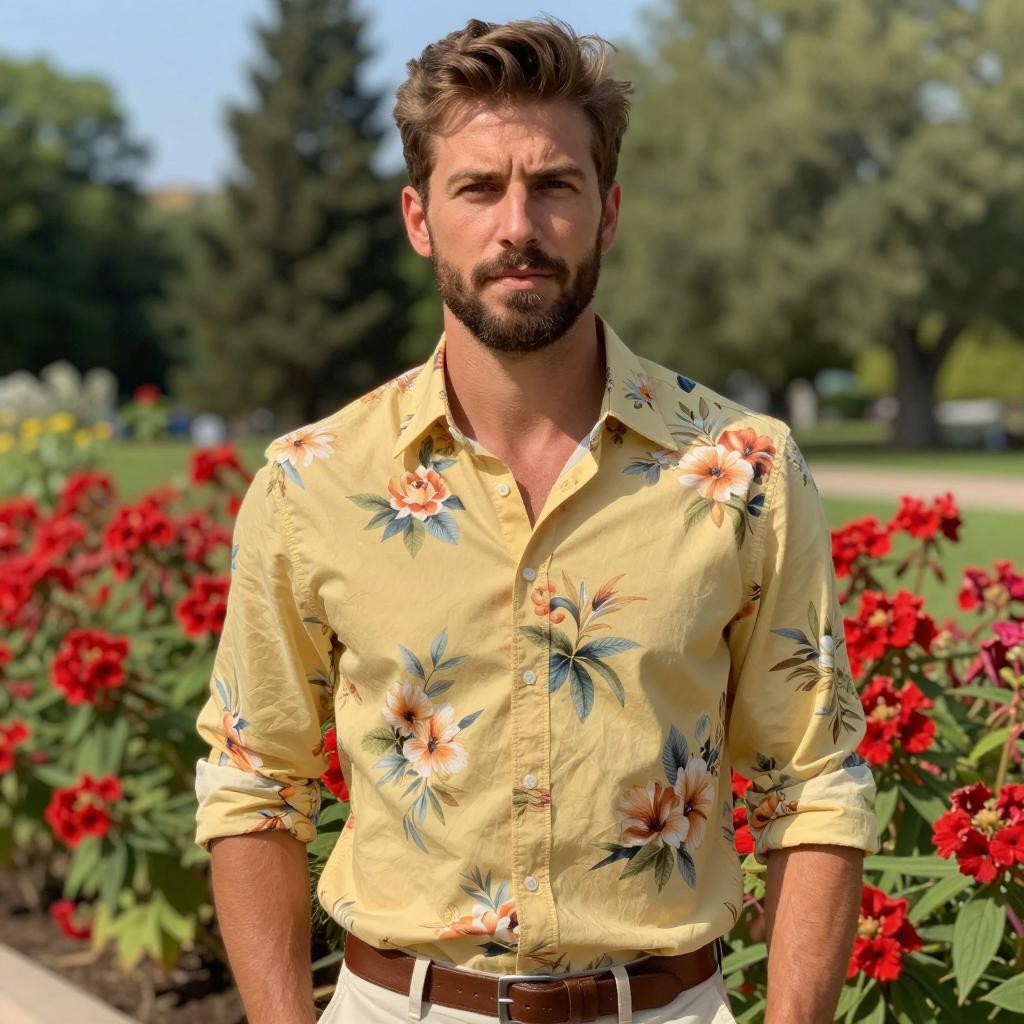 Man summer party outfit, photograph of a handsome young man with light brown hair, short beard, white button-up shirt, standing in front of vibrant pink rose bushes, sunny day, green leaves, soft focus background, casual style, natural light, summer vibe, centered subject, slightly smiling, relaxed pose
