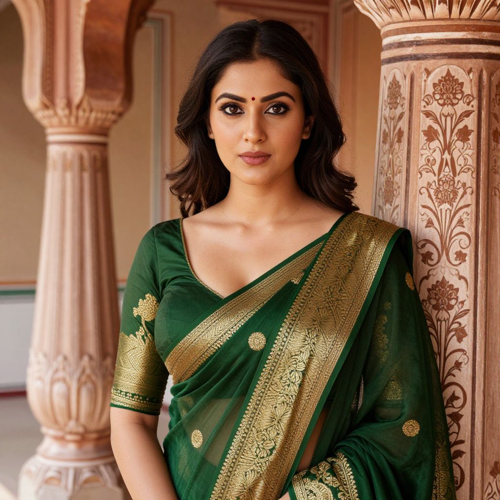 A beautiful Indian woman with deep brown eyes, smooth porcelain skin, and a graceful facial structure wears a stunning green paithani saree as a traditional costume, the intricate gold zari work catching the sunlight in a classic royal palace setting with ornate wood pillars and delicate floral motifs in the background.. The woman has big tits and cute face