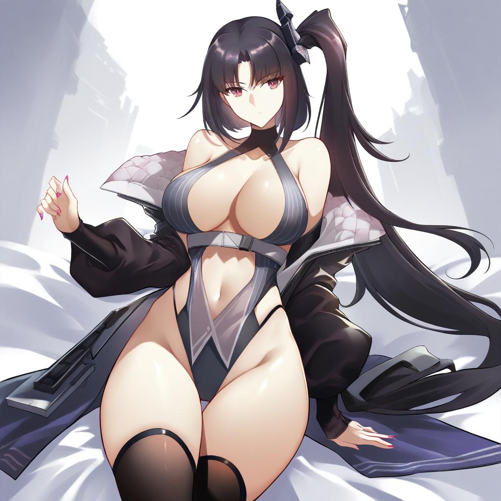Architect (girls' frontline), girls' frontline, 1girl, pink eyes, purple eyes, black hair, very long hair, side ponytail, hair ornament, medium breasts, large breasts, cleavage, navel, collarbone, bare shoulders, pink nails, nail polish, one side up, by artist haganef, animagine