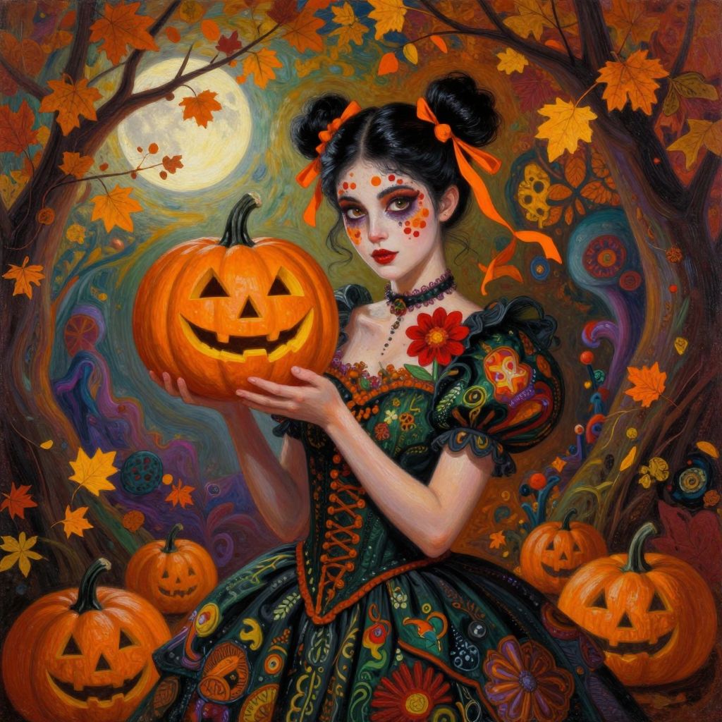 The image is a vibrant and intricate painting that combines elements of Halloween and fantasy art, reminiscent of the styles of artists such as James Jean, Todd Schorr, and Yayoi Kusama. The central figure, a woman with dark, glossy hair styled in two buns adorned with orange ribbons, holds a carved pumpkin in her hand. Her face is painted with red and orange dots, adding to the Halloween theme. She is dressed in an elaborate, dark green dress with intricate floral patterns, and her chest is decorated with a large, red flower. The background is a lush, autumnal scene with orange and yellow leaves, pumpkins, and a full moon, creating a surreal and dreamlike atmosphere. The overall composition is dynamic, with the woman and pumpkin positioned centrally, surrounded by the rich, textured foliage and the glowing moon, which casts a warm light over the scene. The interplay of colors, textures, and shapes creates a visually striking and immersive experience.