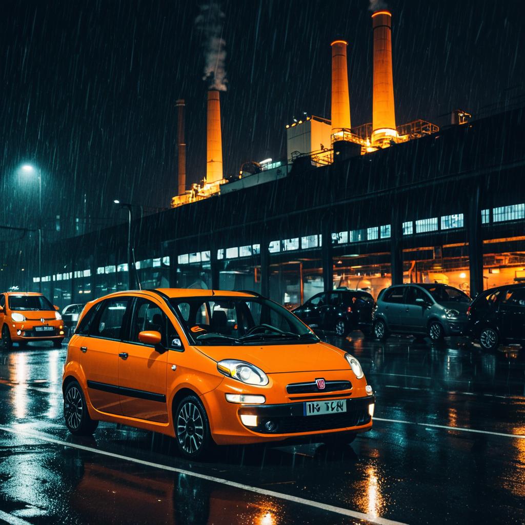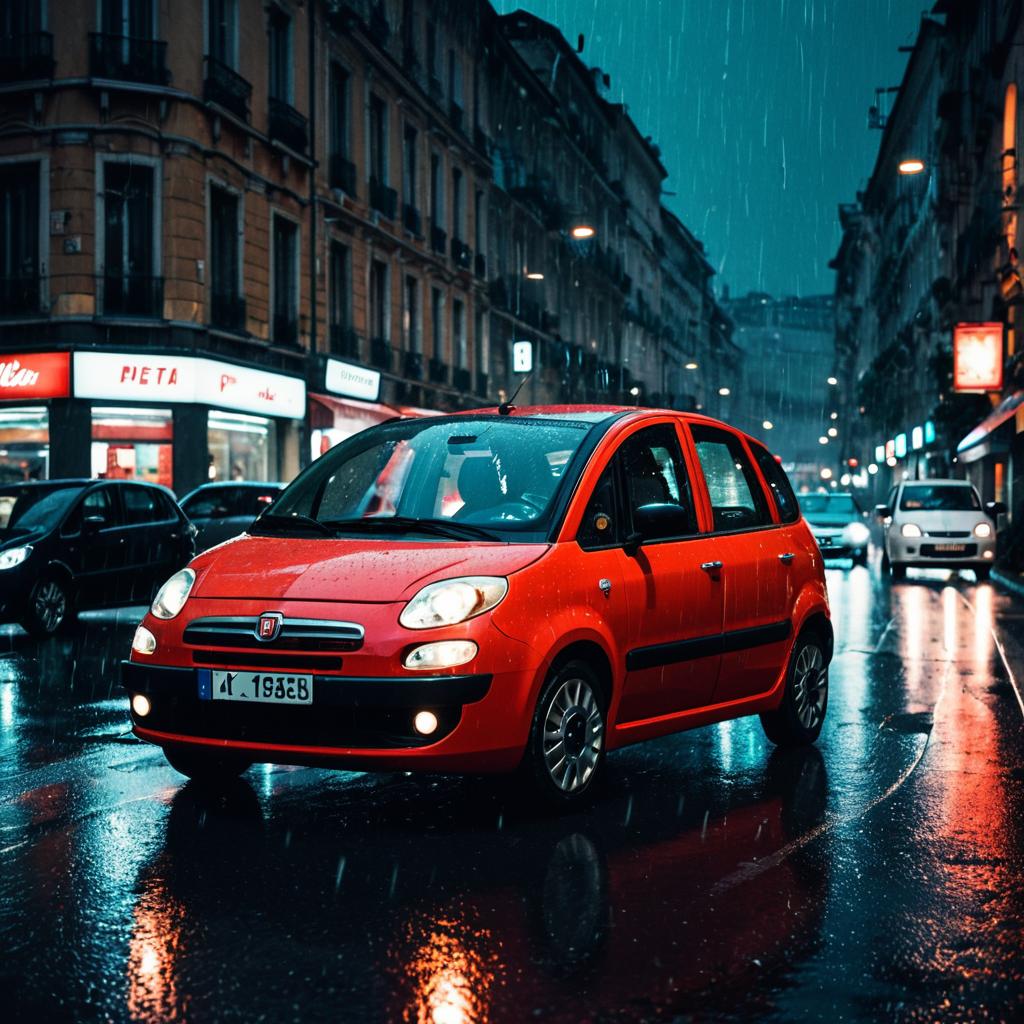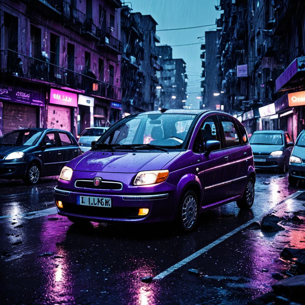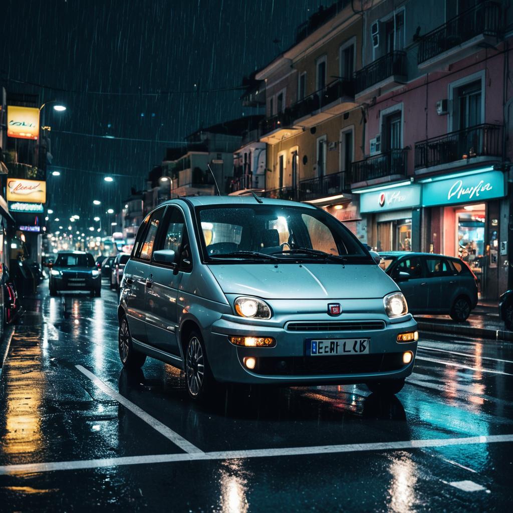 Turquoise Fiat Multipla driving on a wet city street at night under heavy rain. The scene features vibrant vaporwave neon lights and reflections on the road, with blurred cars and illuminated storefronts in the background. The atmosphere is enhanced by saturated pink and blue neon signage typical of a modern urban environment.