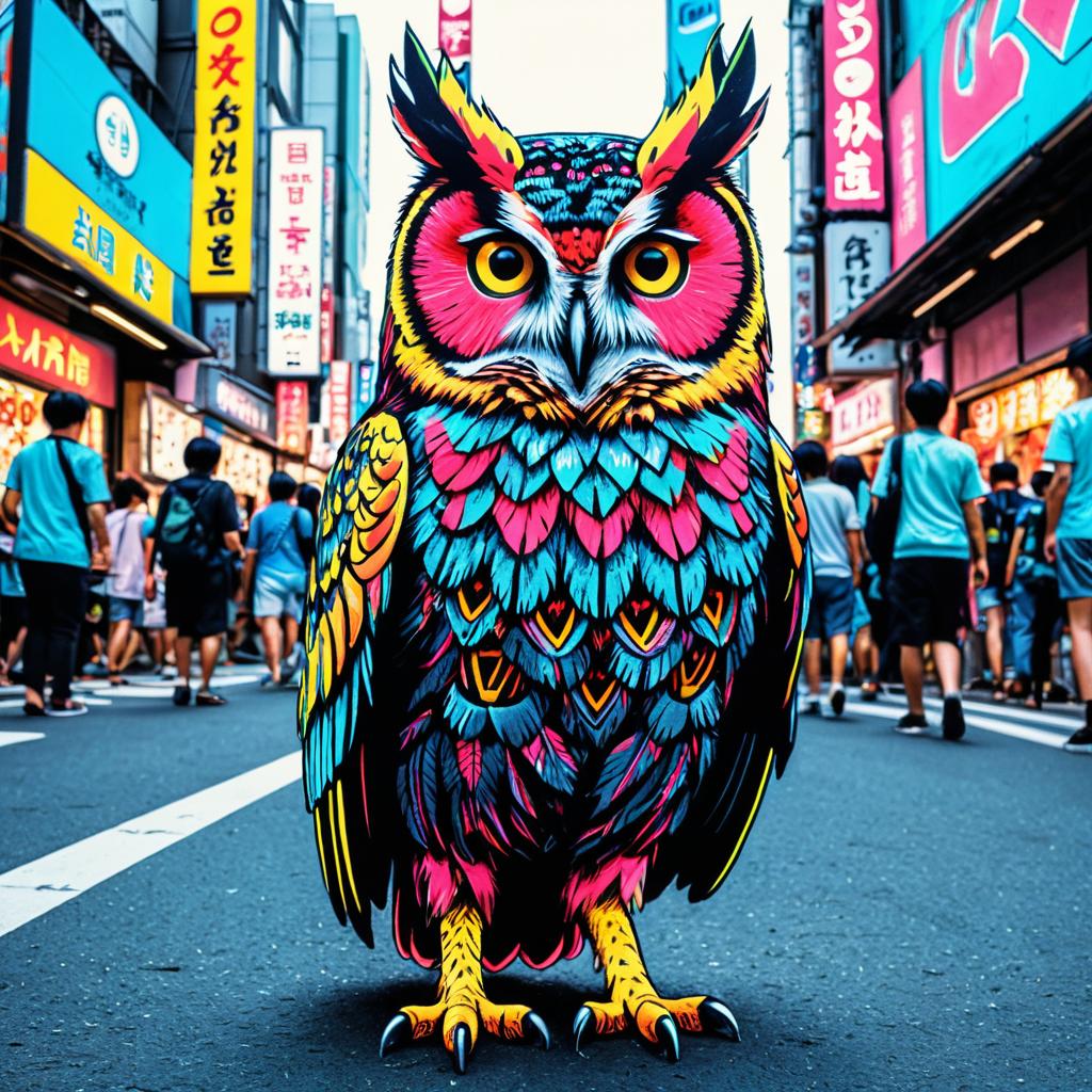 Pop art style image featuring a detailed parrot with vibrant feathers wearing tropical-themed clothing. The parrot stands in the middle of a busy street festival in a cyberpunk-inspired Japanese city. Bright, colorful buildings and crowds of people wearing casual clothing form the lively background.