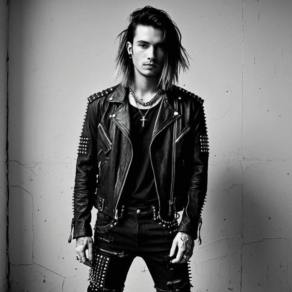 Edgy musician, messy shoulder-length dyed hair, lean build, all black outfit men, sleek monochrome style, black sheer mesh shirt, black studded biker jacket, black distressed leather pants, black combat boots, chain necklace, punk