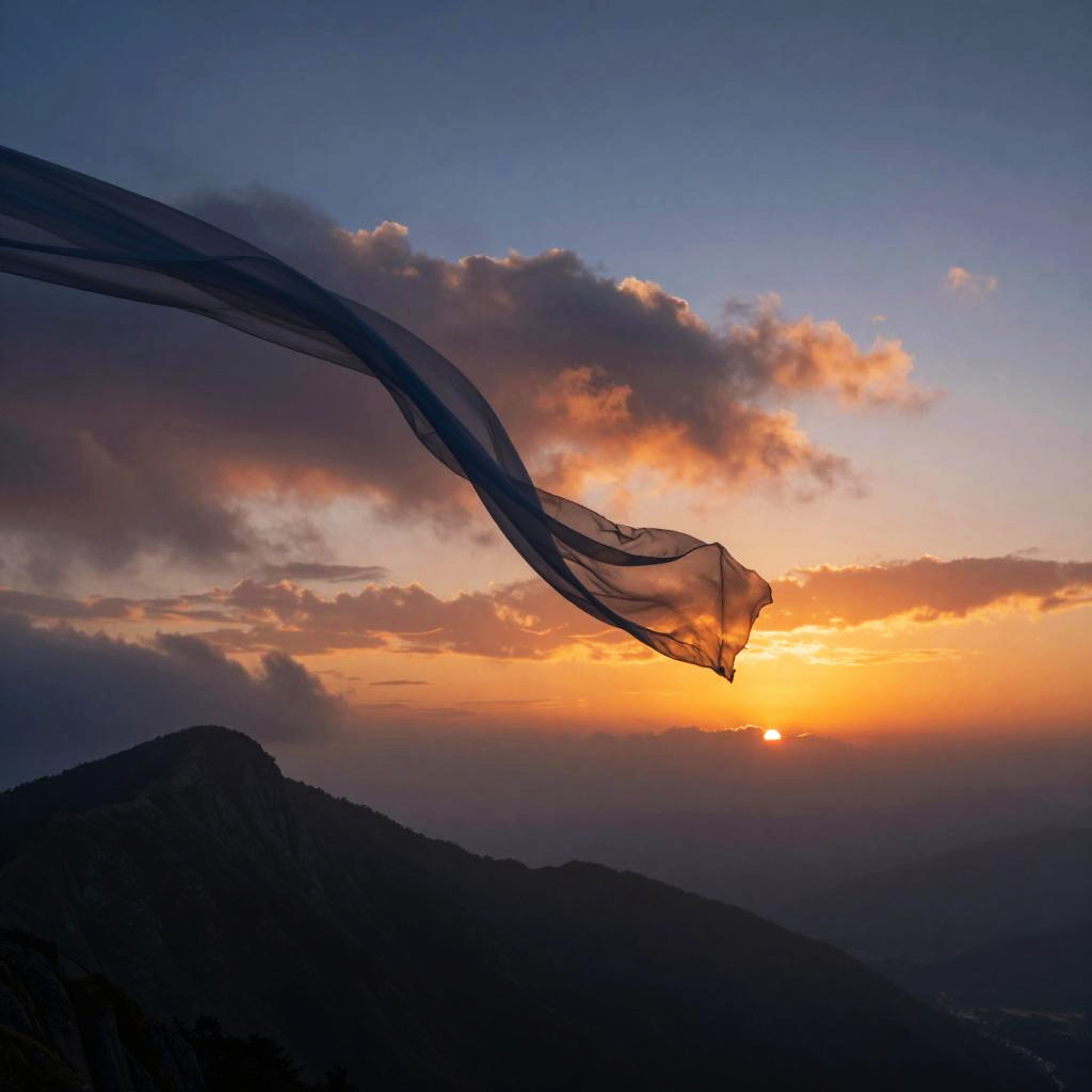 Mystical scene of schal flowing like a ribbon in the wind over a mountain ridge at sunrise, gradient colors from deep blue to fiery orange, soft clouds and glowing horizon, blending nature's majesty with elegant fabric movement, surreal and captivating