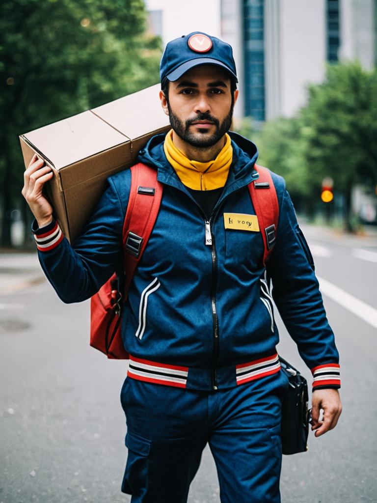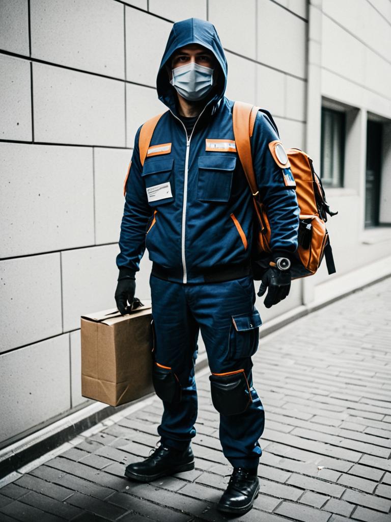 A man dressed as a courier wearing a blue and orange uniform with a hooded jacket and matching pants. He is equipped with a large orange backpack and black gloves, holding a brown delivery box in one hand. The man is also wearing a protective face mask and black boots, standing against a modern tiled wall outdoors.