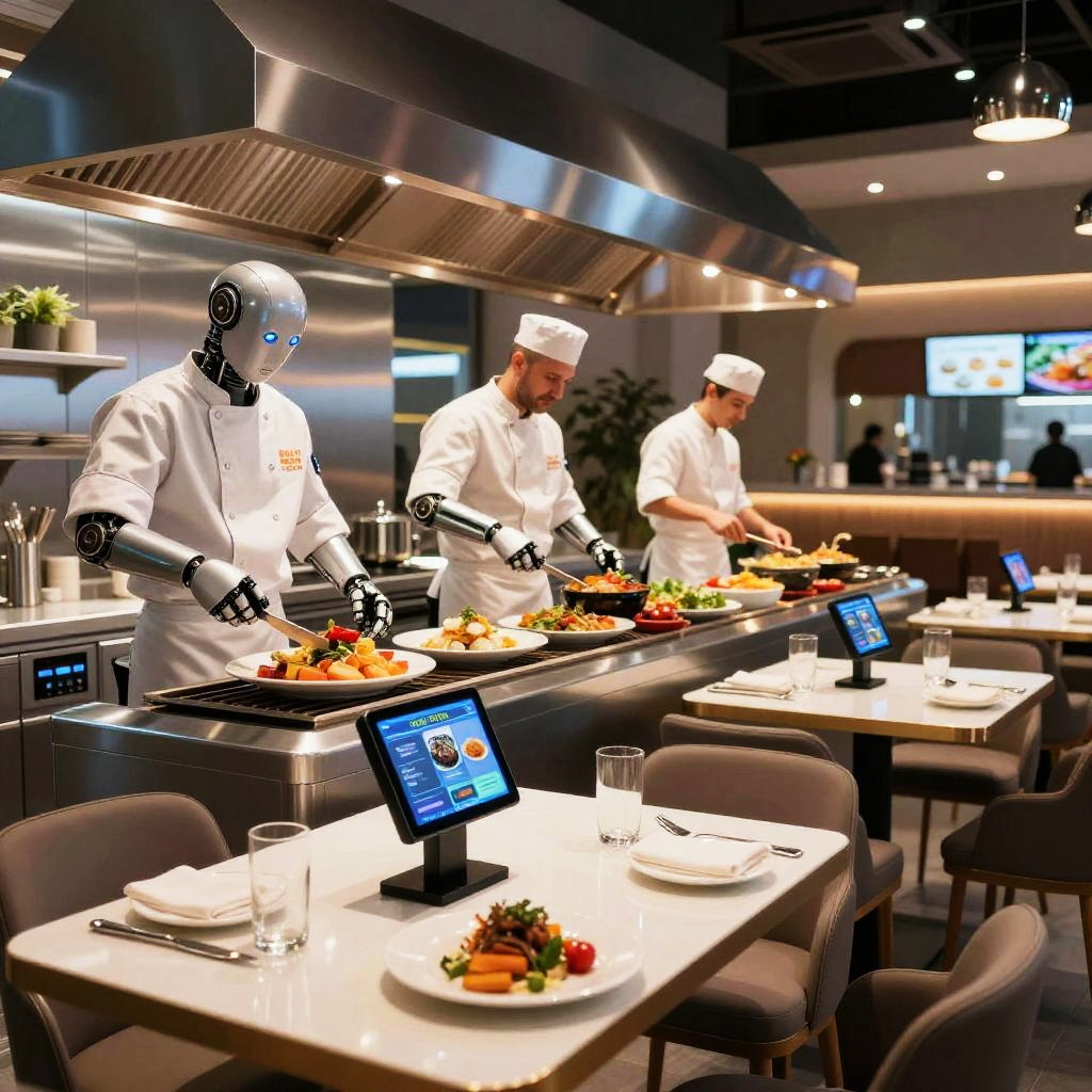 Restaurant generator concept showcasing a futuristic kitchen with robotic chefs preparing diverse international cuisines, sleek modern dining area with ambient lighting, digital menus displayed on tables, vibrant colors, ultra-realistic style.