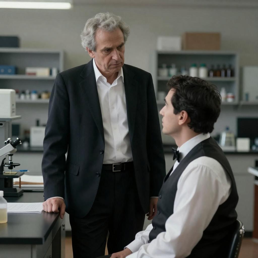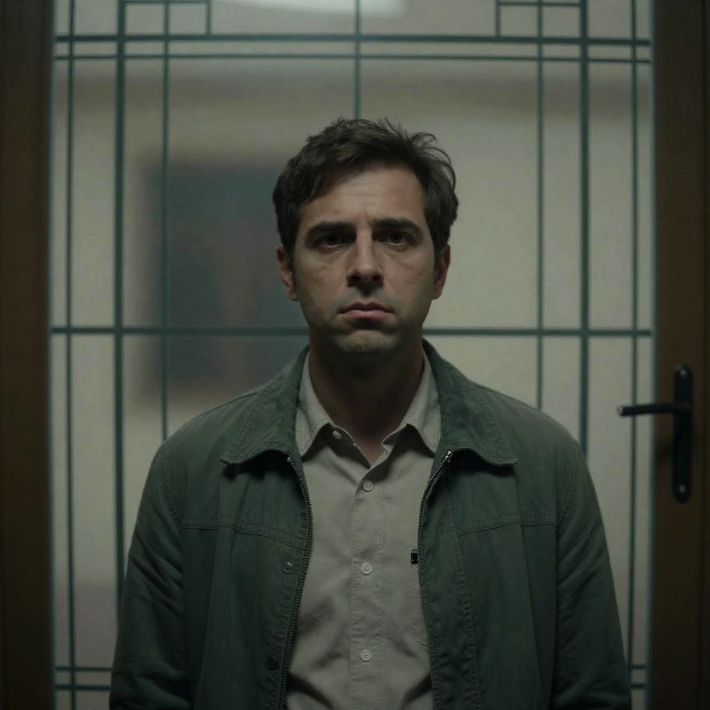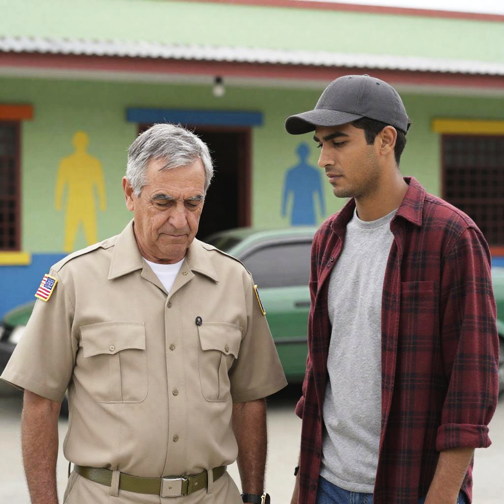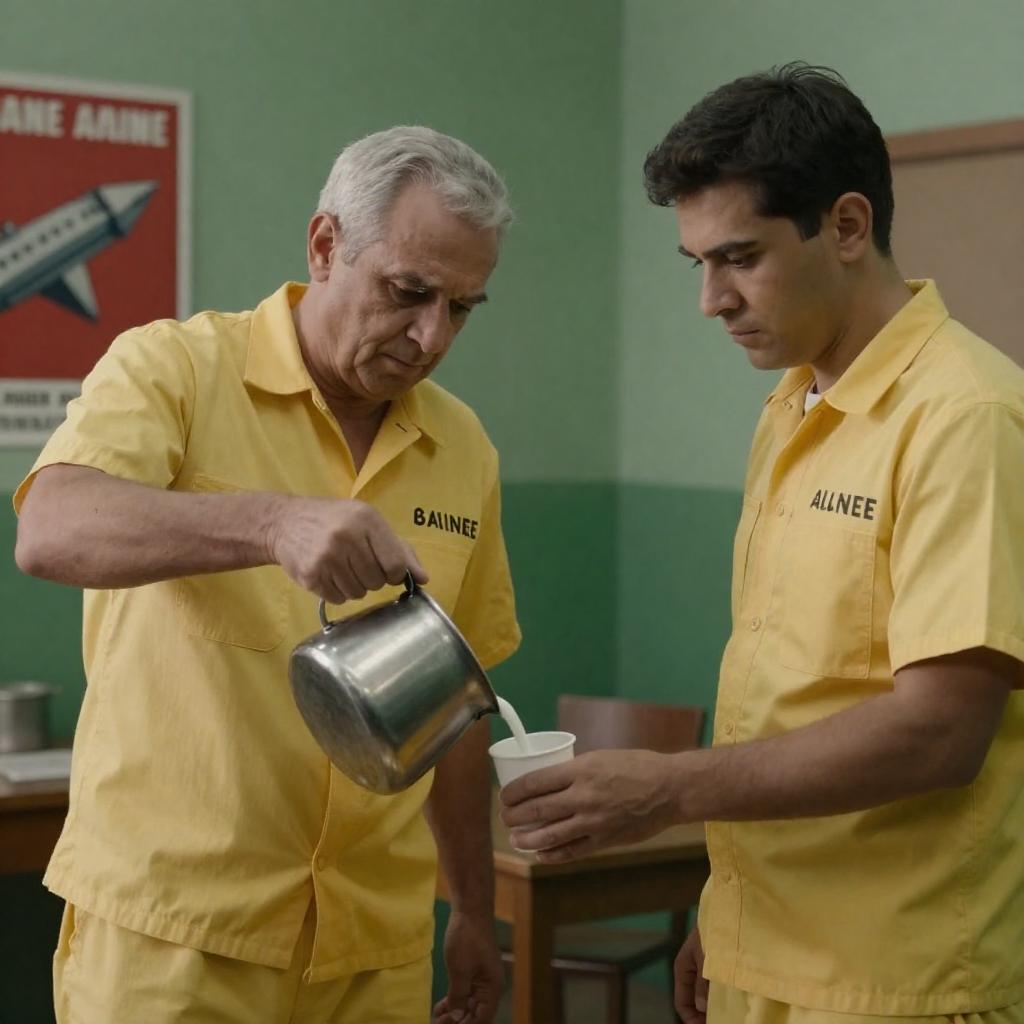 Two men in yellow prison uniforms, one with gray hair and the other with dark hair, in a green-walled room. The older man pours from a metal pot into a cup held by the younger man. Background includes a wooden table and a chair. Left side has a red and white poster with a spaceship. Intense expressions.