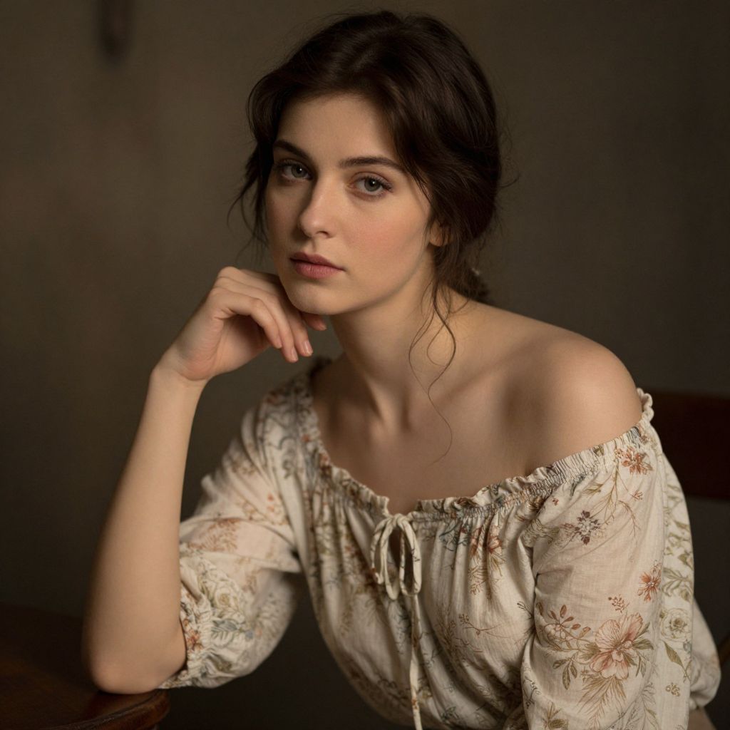 A digital portrait captures a woman in a vintage-inspired off-the-shoulder blouse, her hand resting thoughtfully near her face, set against a rustic backdrop with dramatic lighting that enhances the timeless, contemplative mood reminiscent of Kenneth Hayes Miller's style.