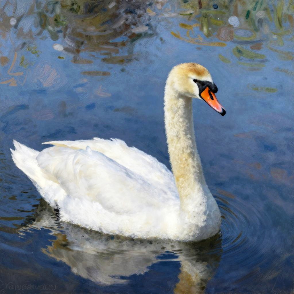 Impressionist illustration of swan by Claude Monet, Pierre-Auguste Renoir, high detail, pop art influences.