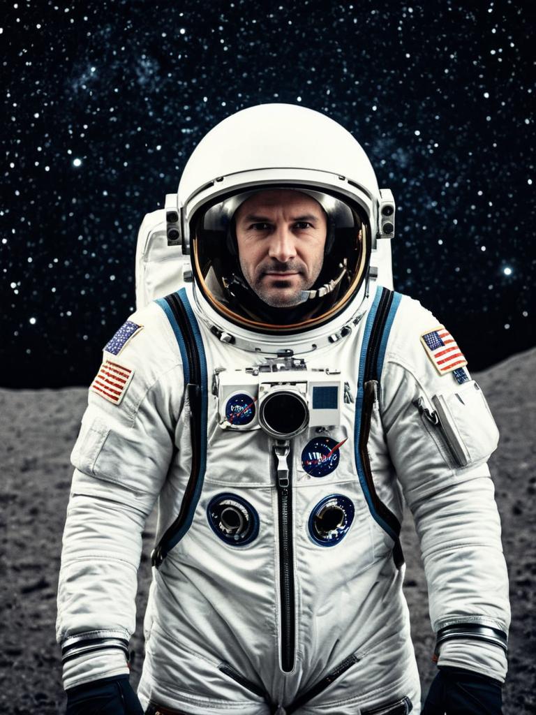 Man in Astronaut Costume, photorealistic outdoor portrait with space backdrop