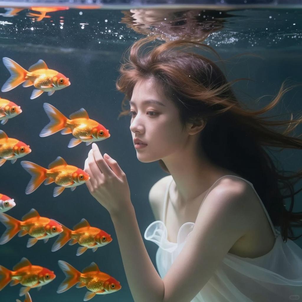 A young woman with white hair and light skin is swimming underwater wearing a white spaghetti strap dress. She has her eyes closed and is smiling gently, with bubbles and light rays surrounding her. The scene captures a serene, glowing atmosphere with sparkling light particles and flowing hair.