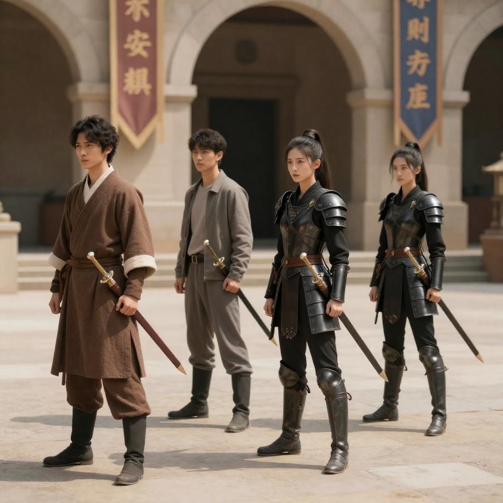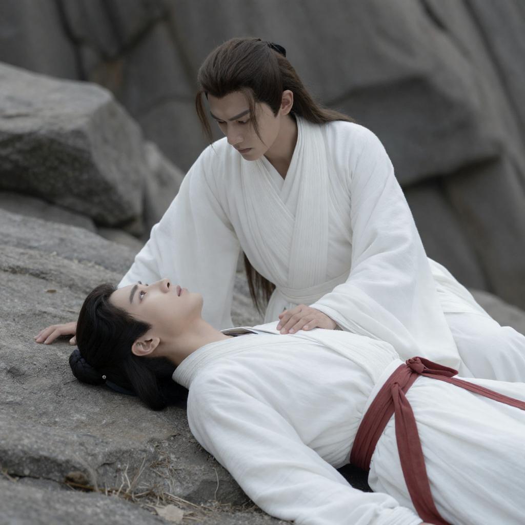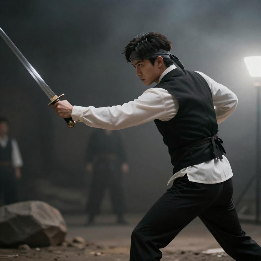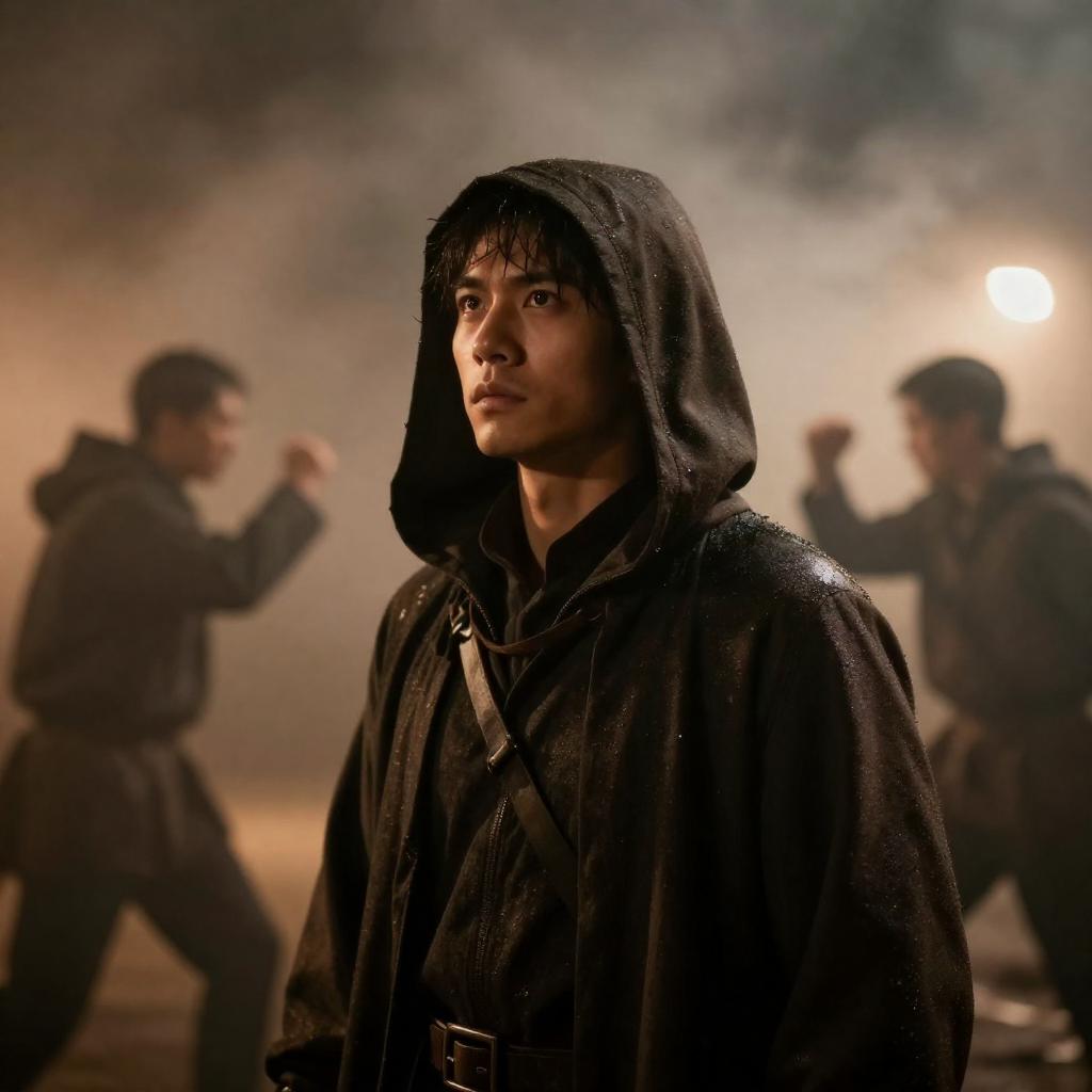 Photograph of two men facing each other in a dramatic, red-lit setting. The bald man on the left wears black, shiny armor with a red cape and holds a spiked staff. The man on the right has dark hair, wears a black outfit, and gazes intently at the armored man. The background features abstract, glowing red patterns.