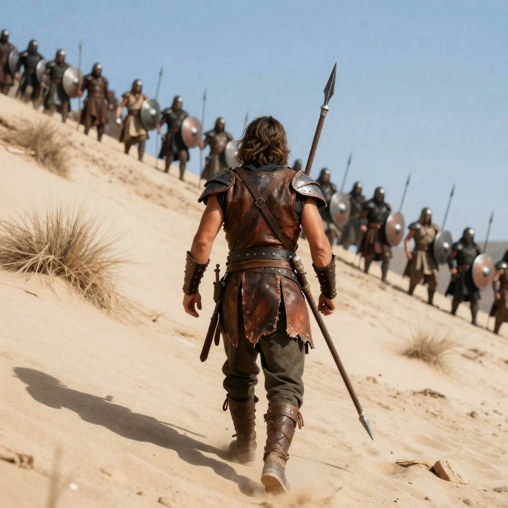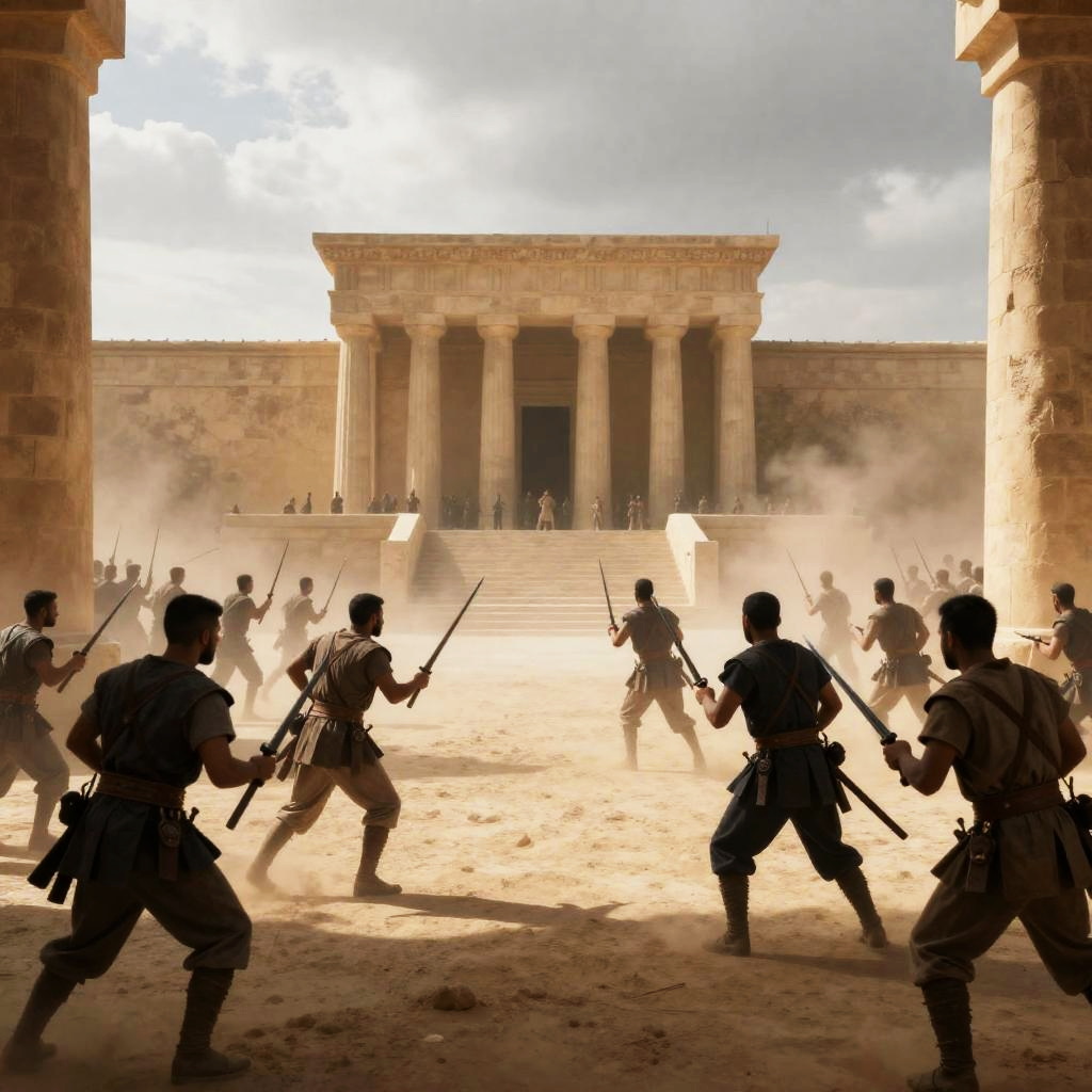 Photograph of an epic battle scene. Large stone building in background with tall pillars on either side. Numerous soldiers in mid-action, some running, others fighting. Sandy landscape under a cloudy sky. Soldiers in various poses, some with raised weapons. Dark foreground contrasts with illuminated battlefield. Intense expressions on some soldiers.