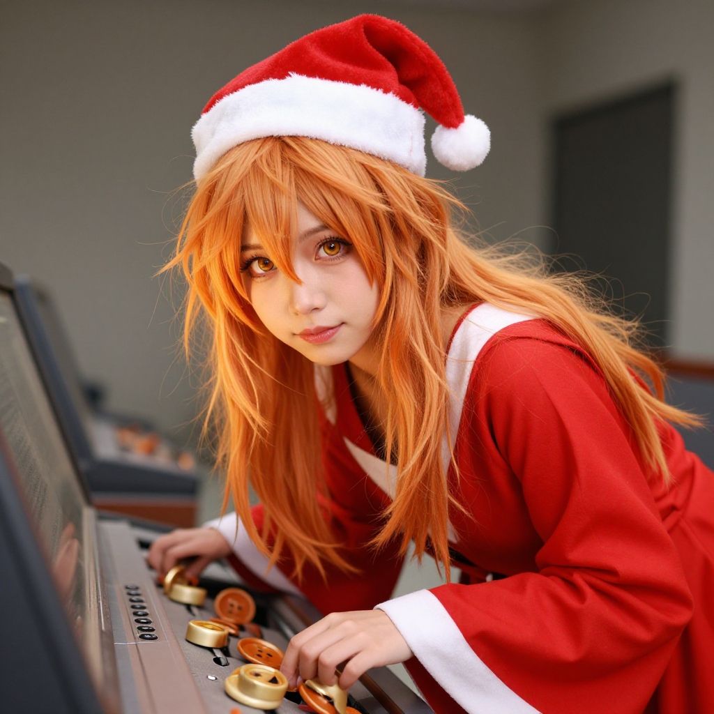 Beautiful amber eyes) long hair messy hair strawberry blonde with mini santa hat with wide sleeves halloween costume amused, she make bent over large buttons in a radio booth, in summer by Hiroshi Sugimoto Firelight, (epic scene:1.3), ultradetialed character with perfect face, detailed skin, (ultrasharp:1.3), (masterpiece:1.1), best quality, (photorealistic:1.2), ultrarealistic, realistic ultradetailed character, 4k perfect quality, Imperceptible detail, Intricately designed