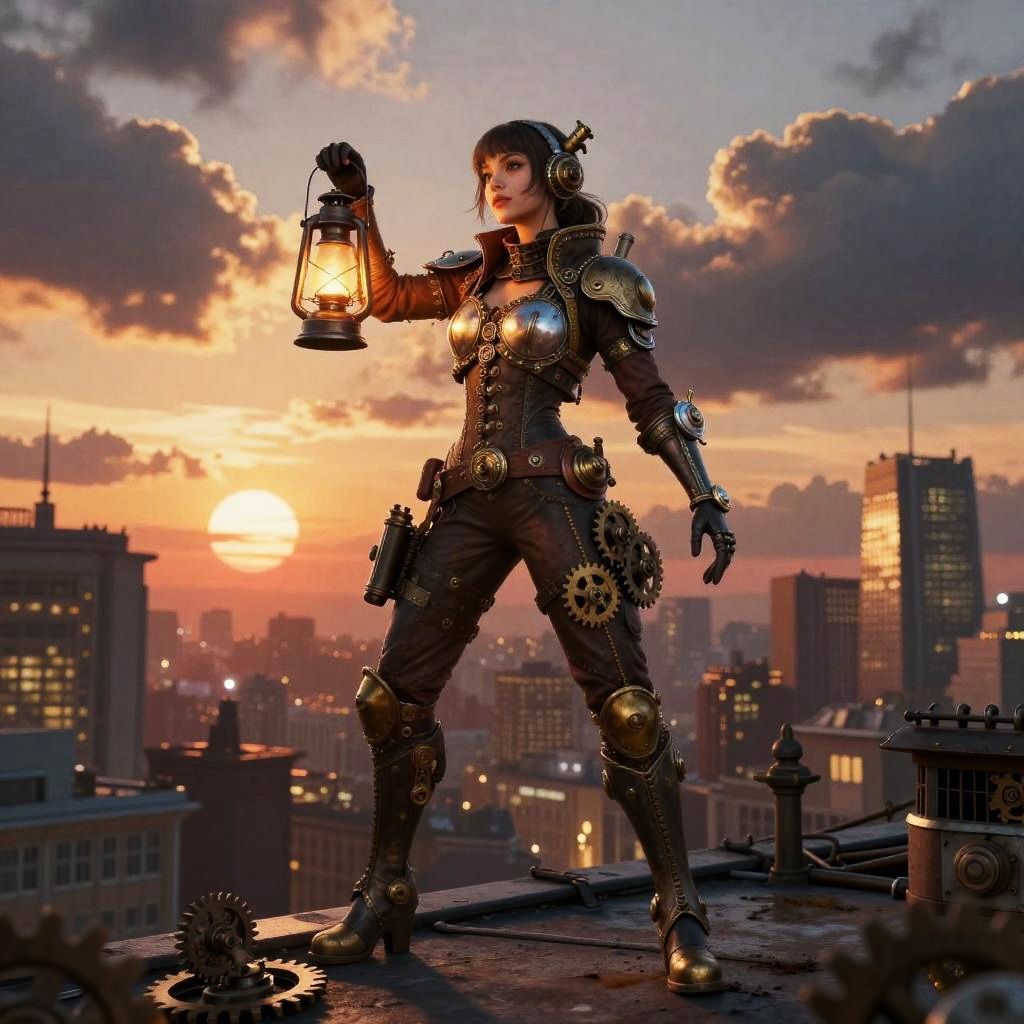 Character with short red hair wearing an elegant steampunk outfit, surrounded by gears and vintage machinery, intricate details in clothing textures, sepia-toned background, antique ambiance, cinematic lighting.