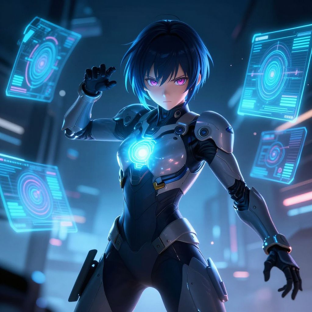 A digital anime-style illustration features a futuristic female cyborg with short black hair and glowing purple eyes. She wears a sleek, black and silver armored suit with glowing blue accents, including a circular blue light on her chest. Her right hand is raised, fingers slightly spread, while her left hand rests by her side. Floating holographic screens with blue circular patterns surround her. The background is a dark, neon-lit cityscape, adding to the sci-fi atmosphere. Her expression is focused and determined, and the overall color palette is dominated by dark blues and blacks with striking neon highlights.