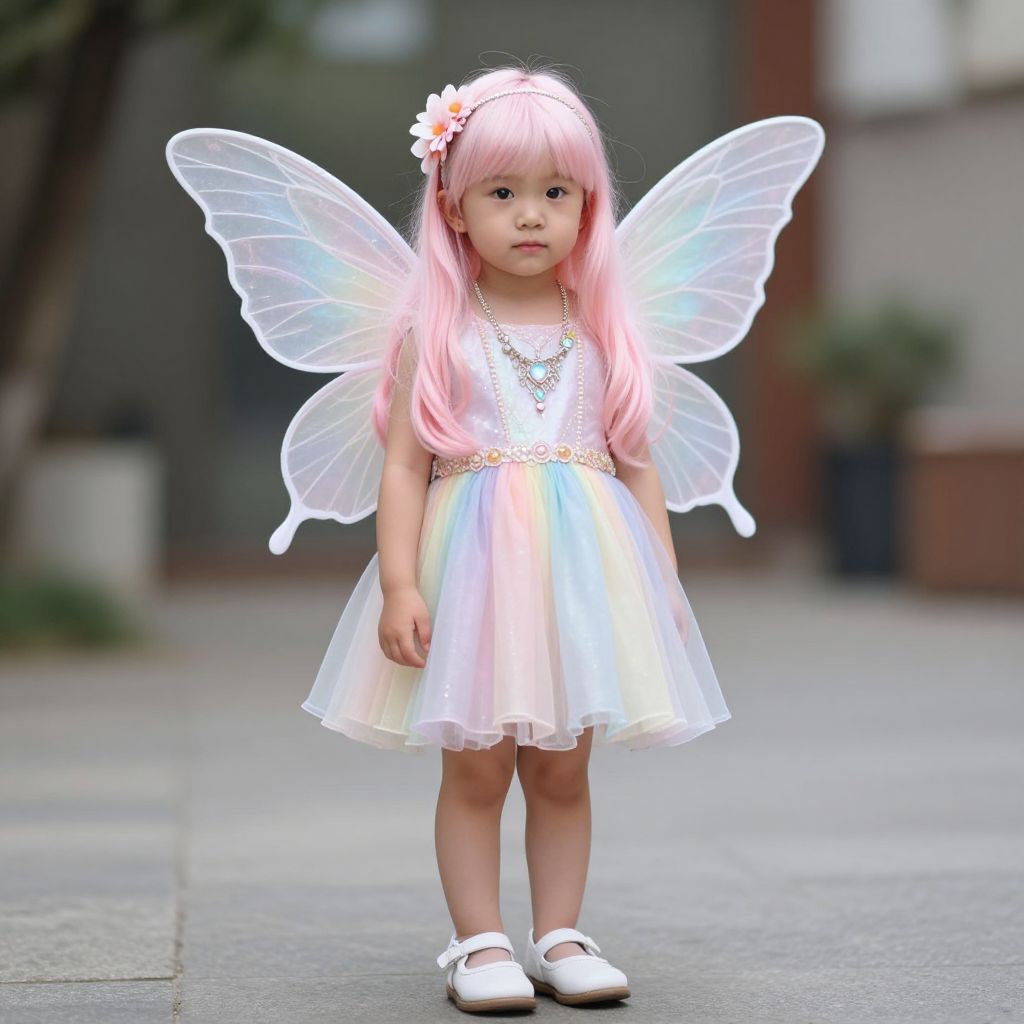 Infant rainbow brite sprite, 1girl, solo, fairy wings, wings, fairy, flower, long hair, blurry background, hairband, shoes, full body, blurry, standing, dress, sleeveless, pink hair, drill hair, skirt, jewelry