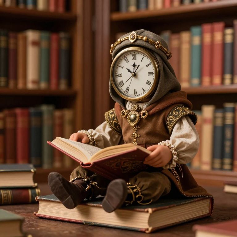 A whimsical clock-faced figure dressed in ornate medieval attire sits amidst a cozy library, intently reading an open book while perched atop another spread volume, surrounded by shelves brimming with colorful books.