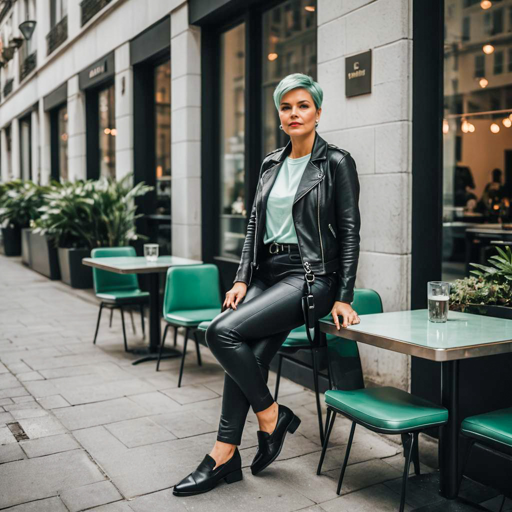 Curvy woman with pixie cut hairstyle wearing a black leather jacket and black suede leather pants paired with a mint green cotton t-shirt. She accessorizes with silver jewelry and black pointed loafers while sitting on a chair outside an urban café with green and brown seating. The scene showcases an edgy, urban chic style with a sleek silhouette and relaxed ambiance.
