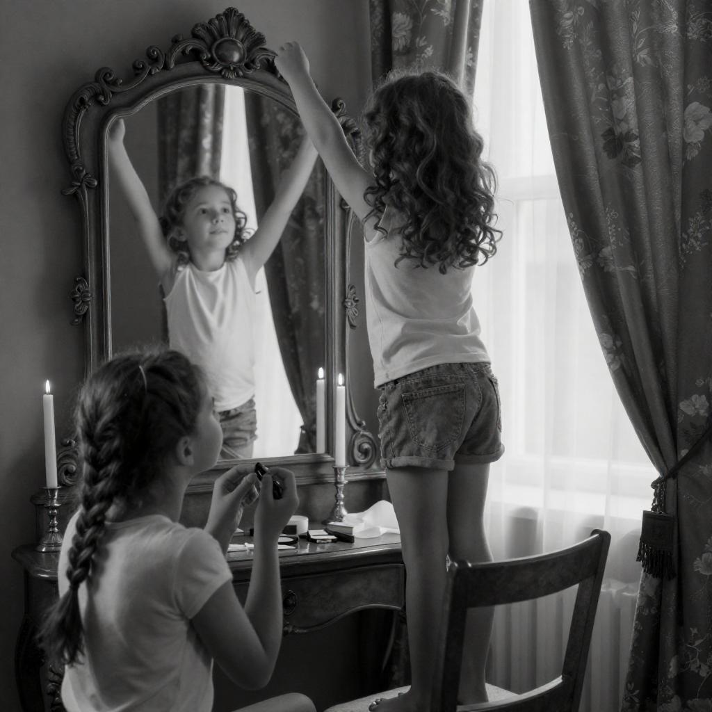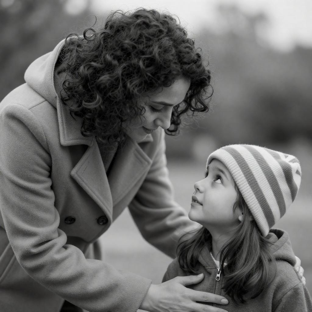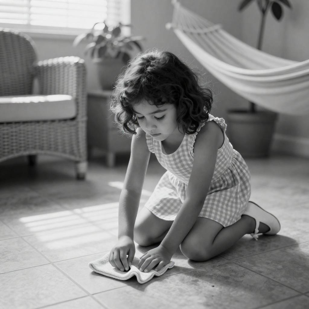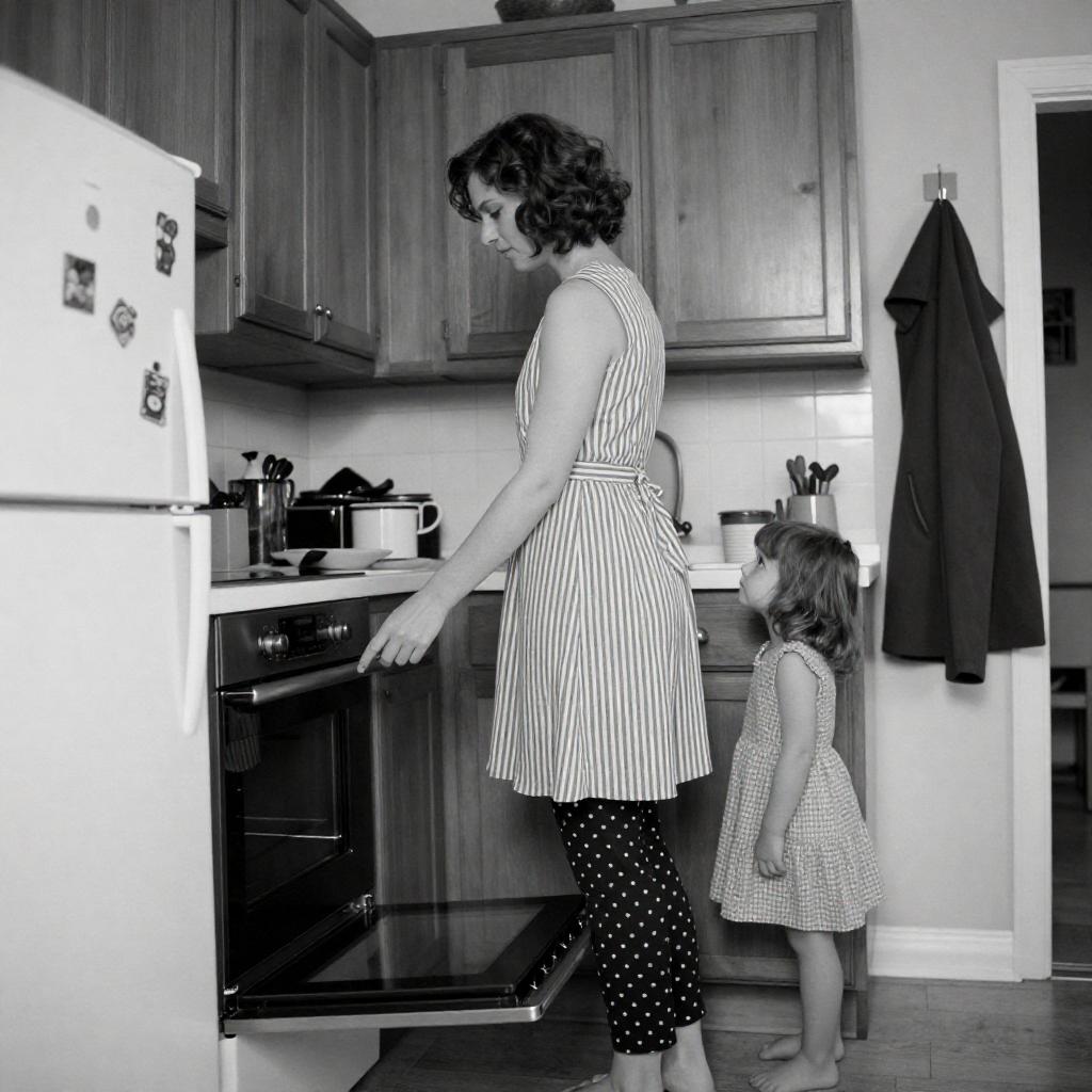 Black-and-white photo of a woman wearing a striped dress and polka dot pants opening an oven door in a retro-style kitchen. A young girl in a sleeveless dress stands barefoot next to her, looking up. The kitchen features wooden cabinets, a refrigerator with magnets, and a coat hanging on a wall hook.