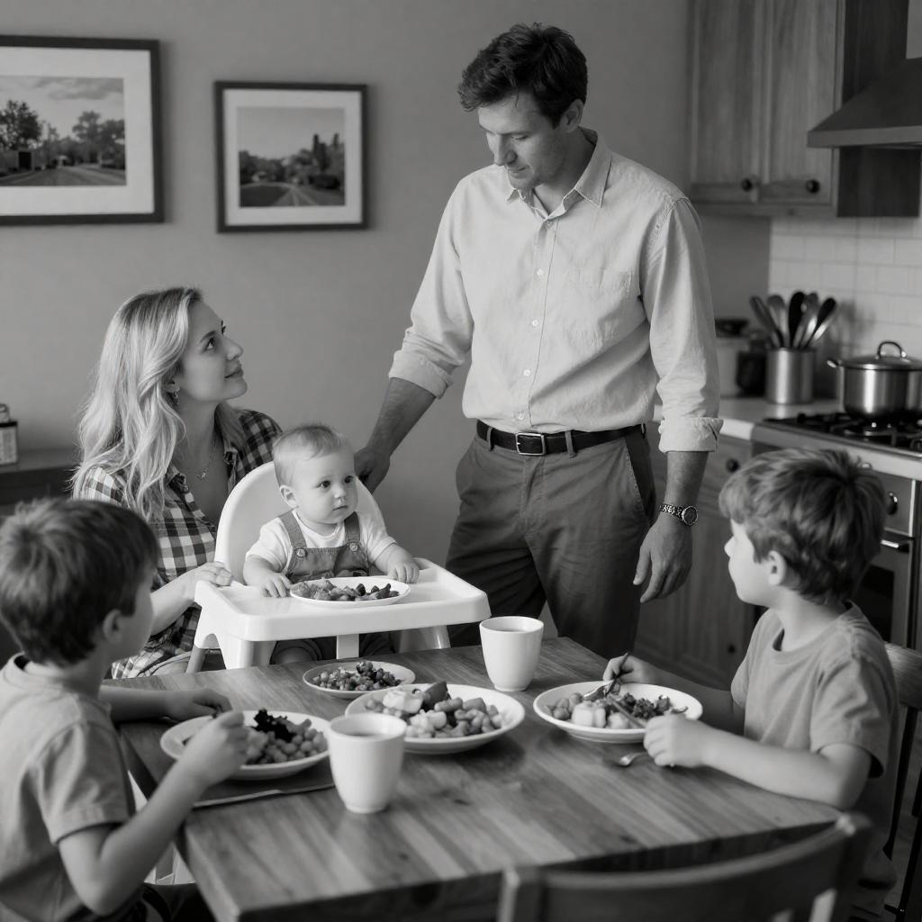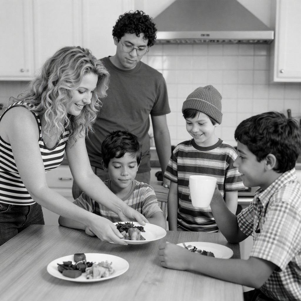 Black-and-white photograph of a woman in a striped dress and polka dot pants, standing in a kitchen, opening an oven door. A young child in a dress leans against the counter, looking up at her. The kitchen has wooden cabinets, a refrigerator with magnets, and a coat hanging on a hook.