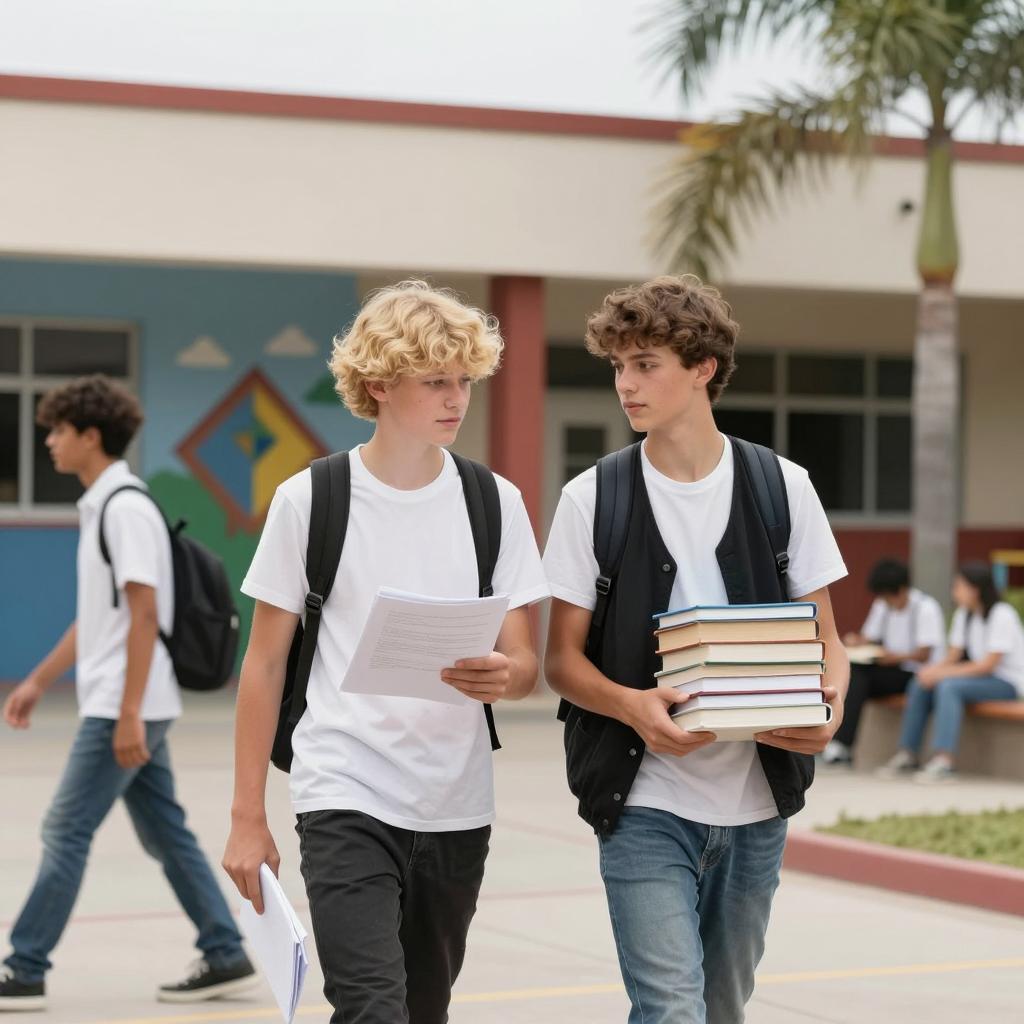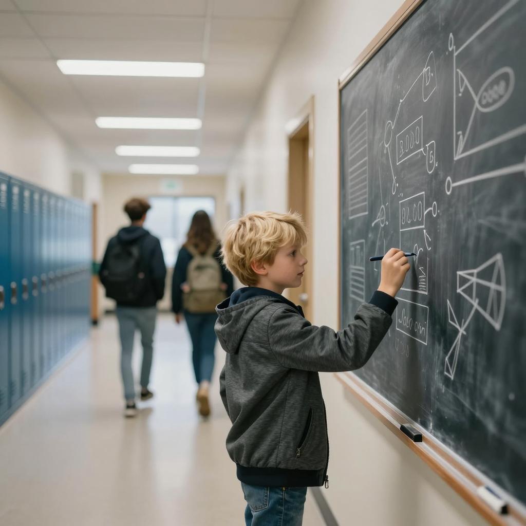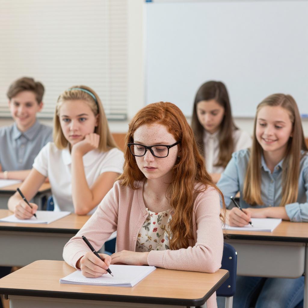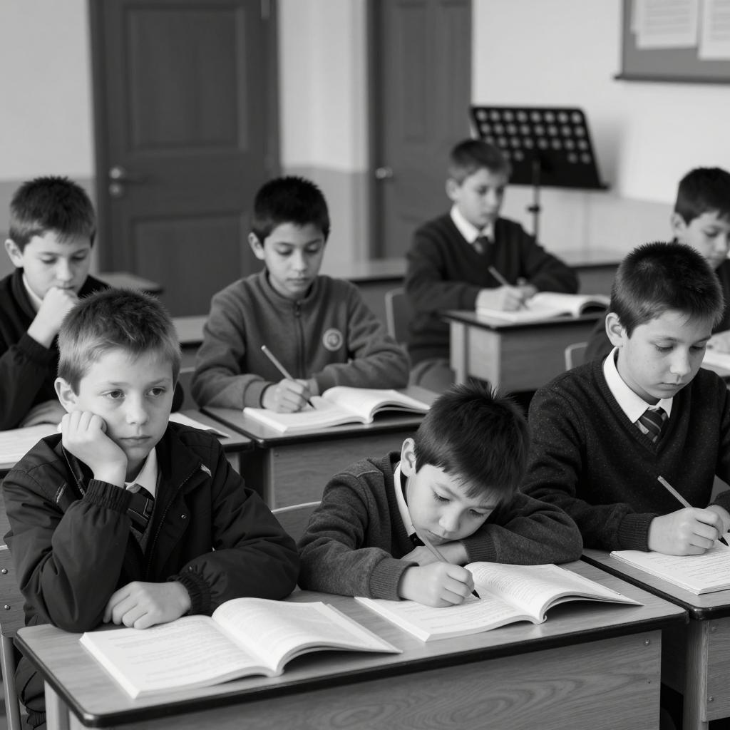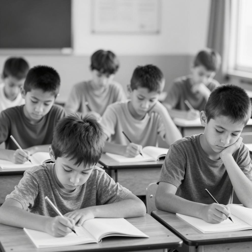 Photograph of a classroom with nine children seated at desks, each using an old-style CRT monitor with headphones. The children are focused on their screens, wearing casual clothing. One boy in the back stands, also wearing headphones, smiling. The background features a brick wall. The room is brightly lit.