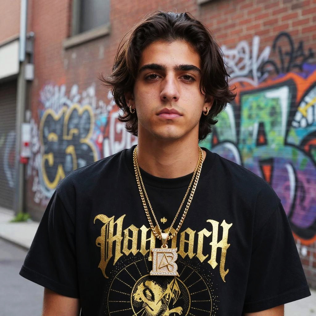 Photograph of a young man with medium-length, dark brown hair, and a serious expression. He's wearing a black T-shirt with gold graphic print, multiple gold chains, including a large pendant, and small earrings. He stands in an urban alley with graffiti-covered brick walls in the background. The lighting is bright, highlighting his facial features and the textures of his clothing and surroundings.