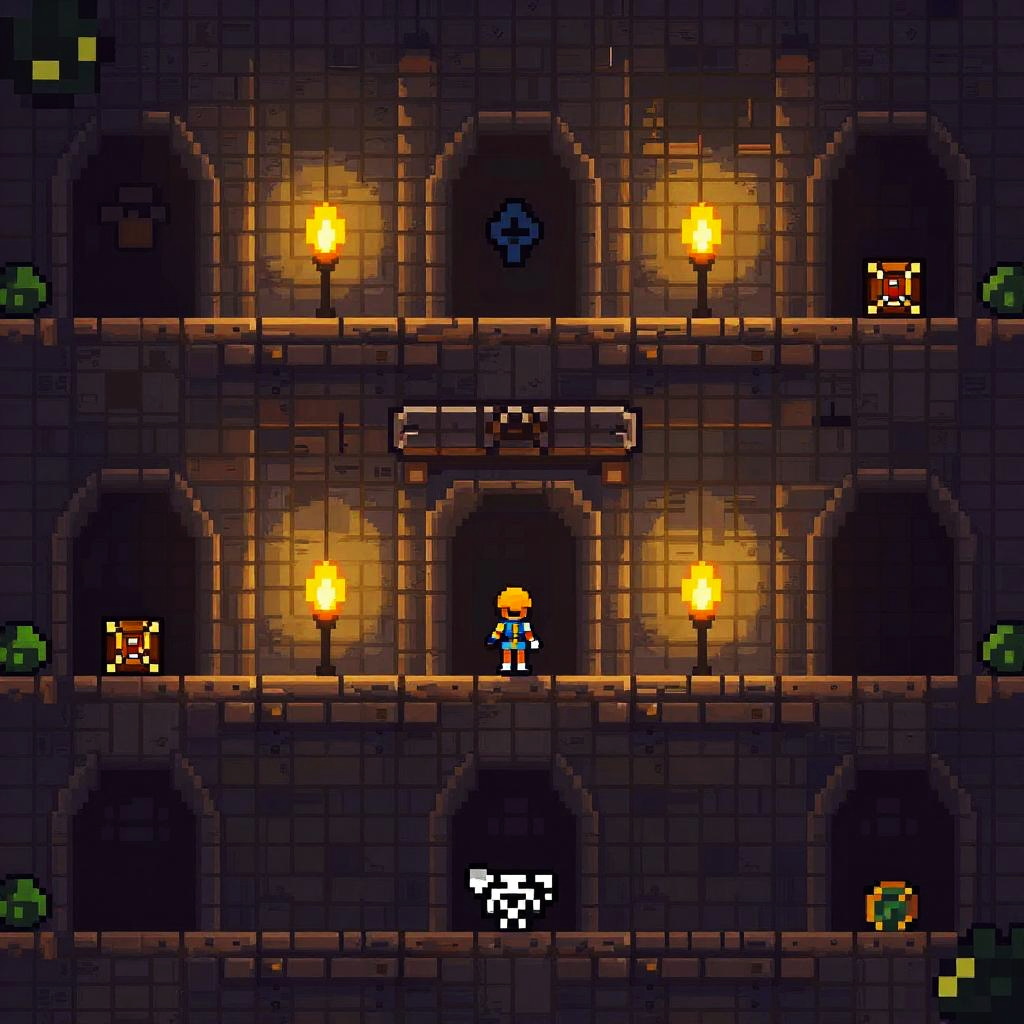 Pixel art Zelda exploring an ancient pixelated dungeon, torchlight casting shadows on pixel stone walls, 16-bit color palette, intricate pixel details, classic top-down view, mysterious atmosphere with hidden treasure and traps