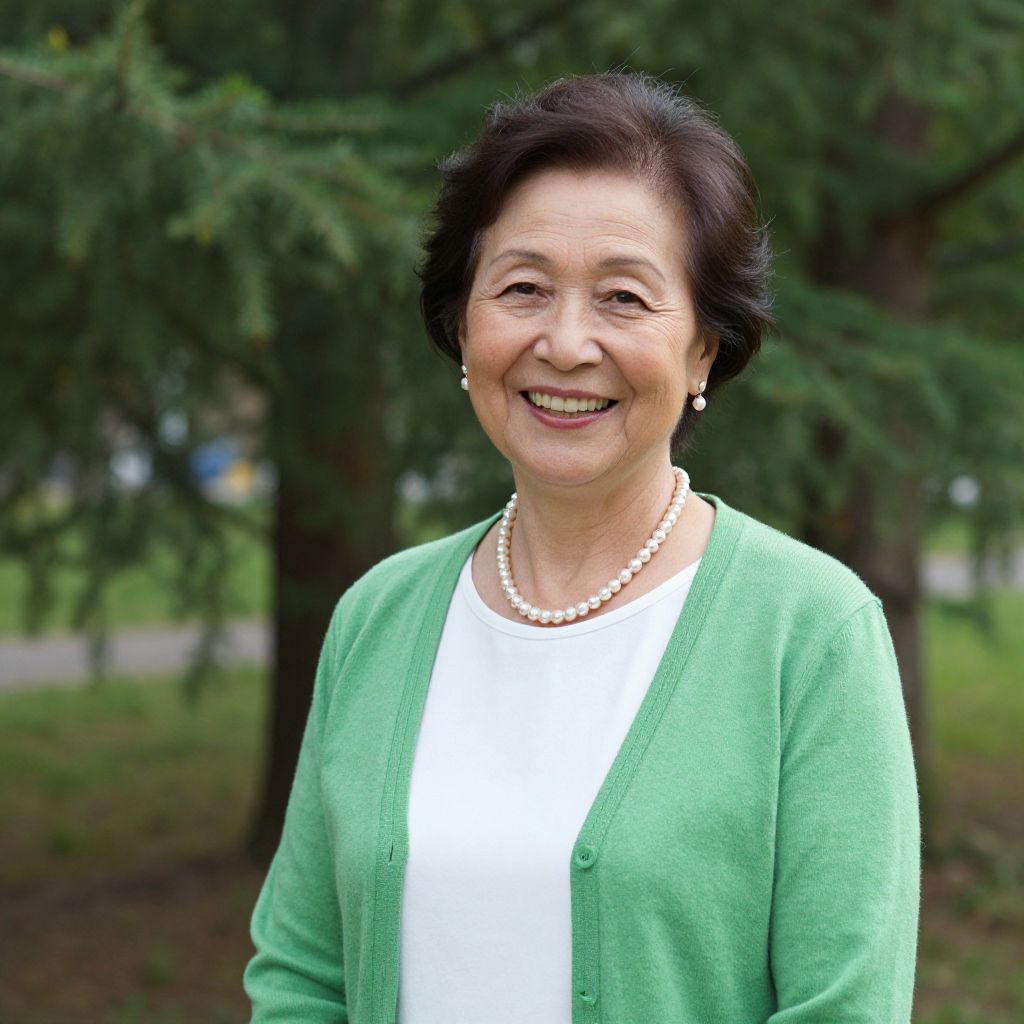 Photograph of an elderly Asian woman with short, wavy black hair and fair skin, smiling warmly. She wears a green cardigan over a white top, paired with a pearl necklace and small pearl earrings. The background features a blurred, lush green park with a pond and tree branches, suggesting a calm, outdoor setting. The woman's attire and accessories exude a classic, elegant style, and her expression is friendly and approachable. The image focuses on her upper body, capturing her from the waist up.