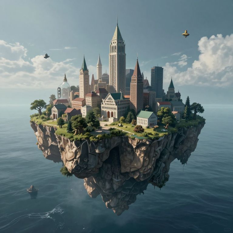 This is a digital CGI rendering of a floating island city, reminiscent of a fantasy world. The island is surrounded by calm, blue ocean waters and features a diverse architectural landscape with various buildings, including tall spires, a central clock tower, and smaller houses. The buildings are primarily made of stone and brick, with green roofs and lush greenery. Two birds are flying in the clear, blue sky with a few fluffy white clouds. A small boat is visible in the water below. The island's edges are rocky, with trees and grass growing on top. The overall scene is bright and vibrant, evoking a sense of wonder and fantasy.